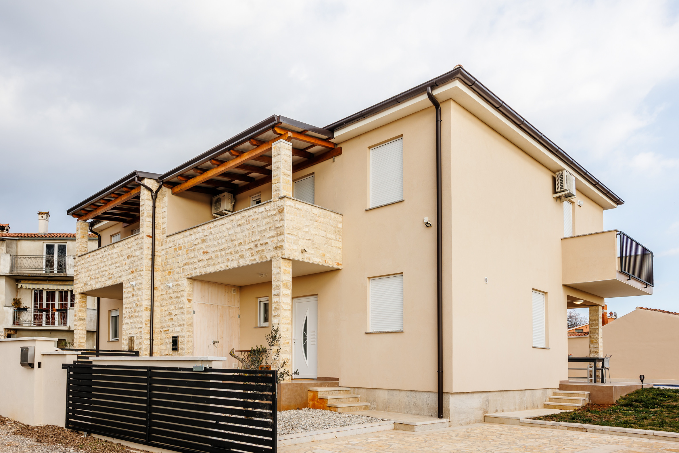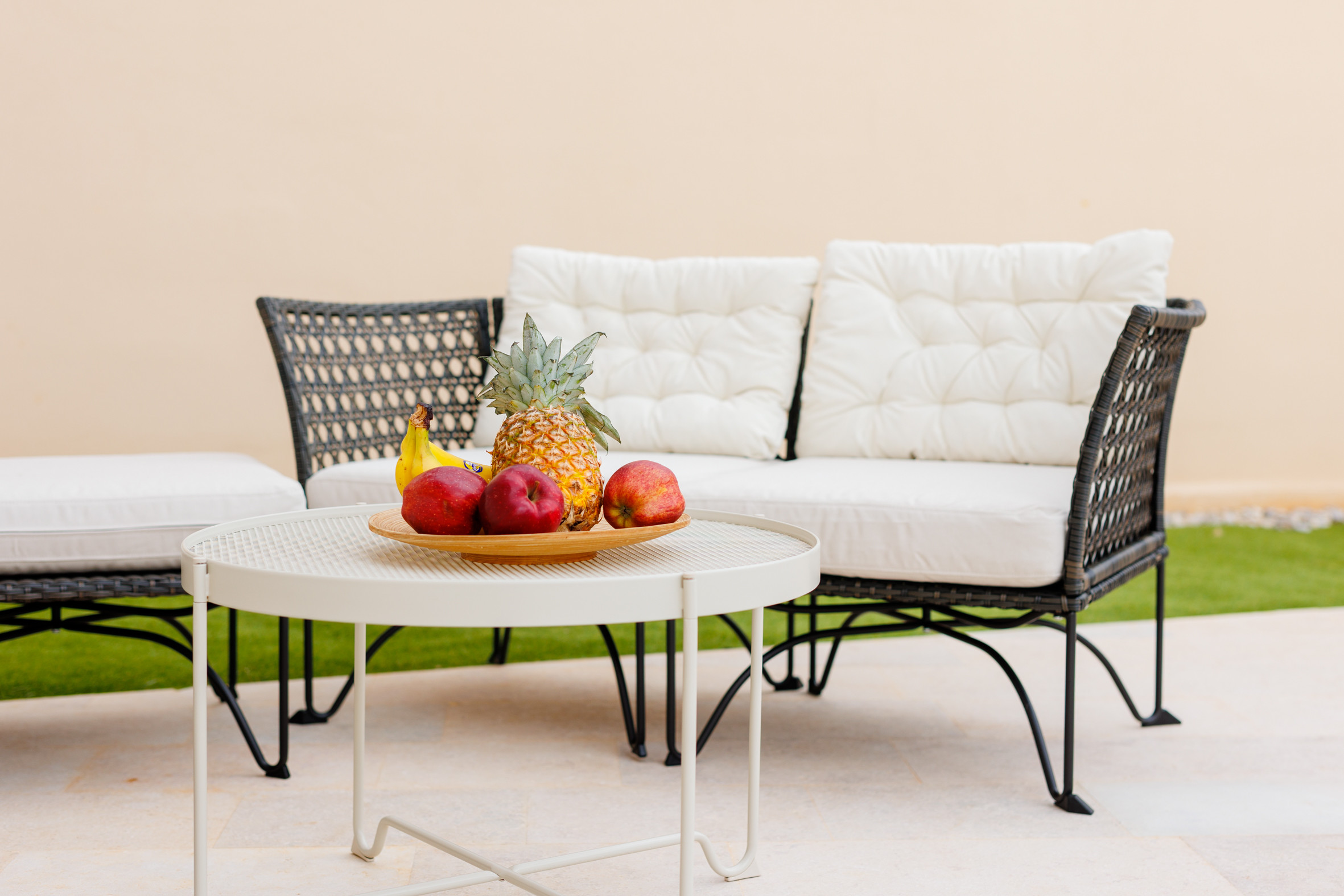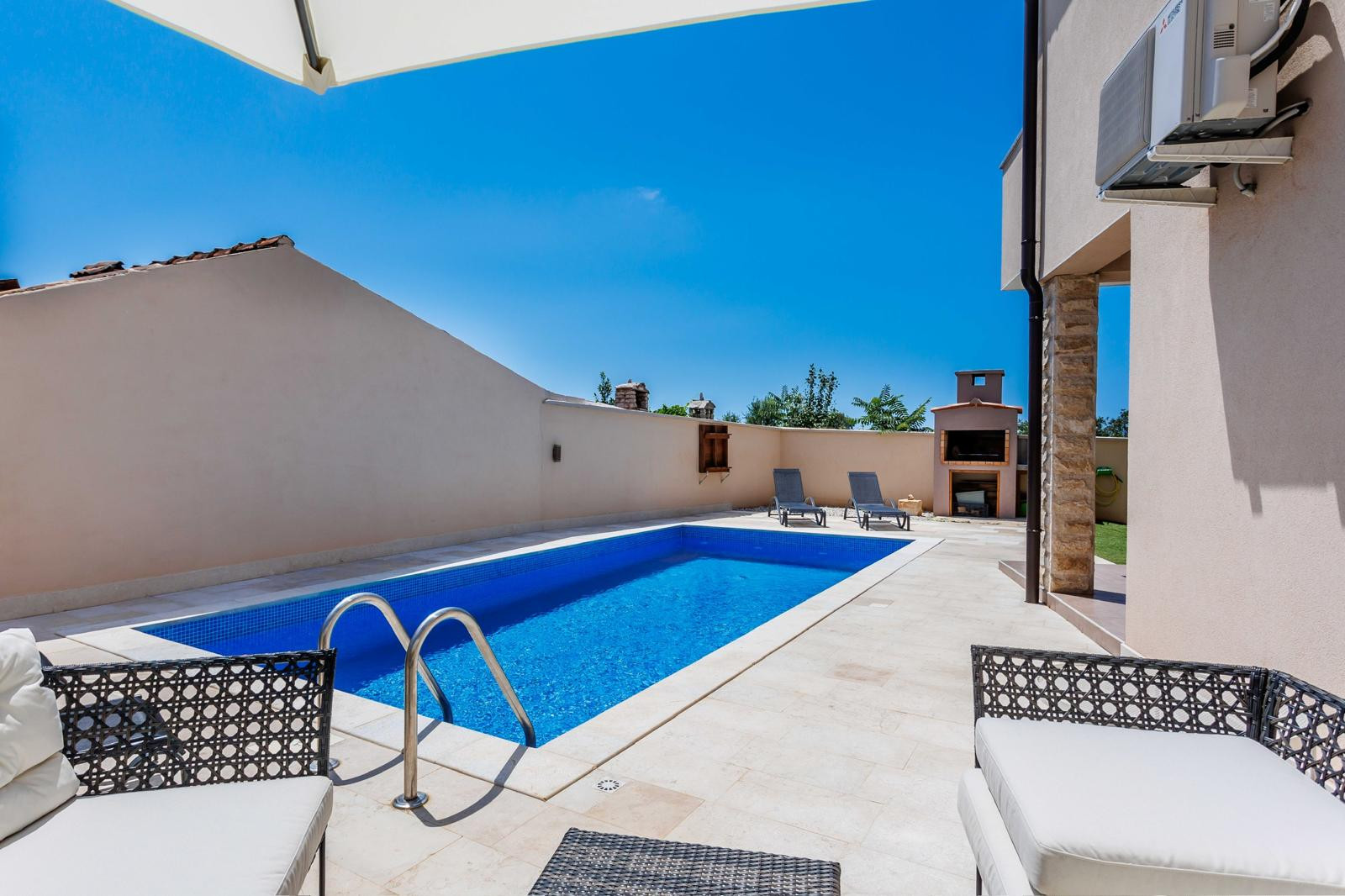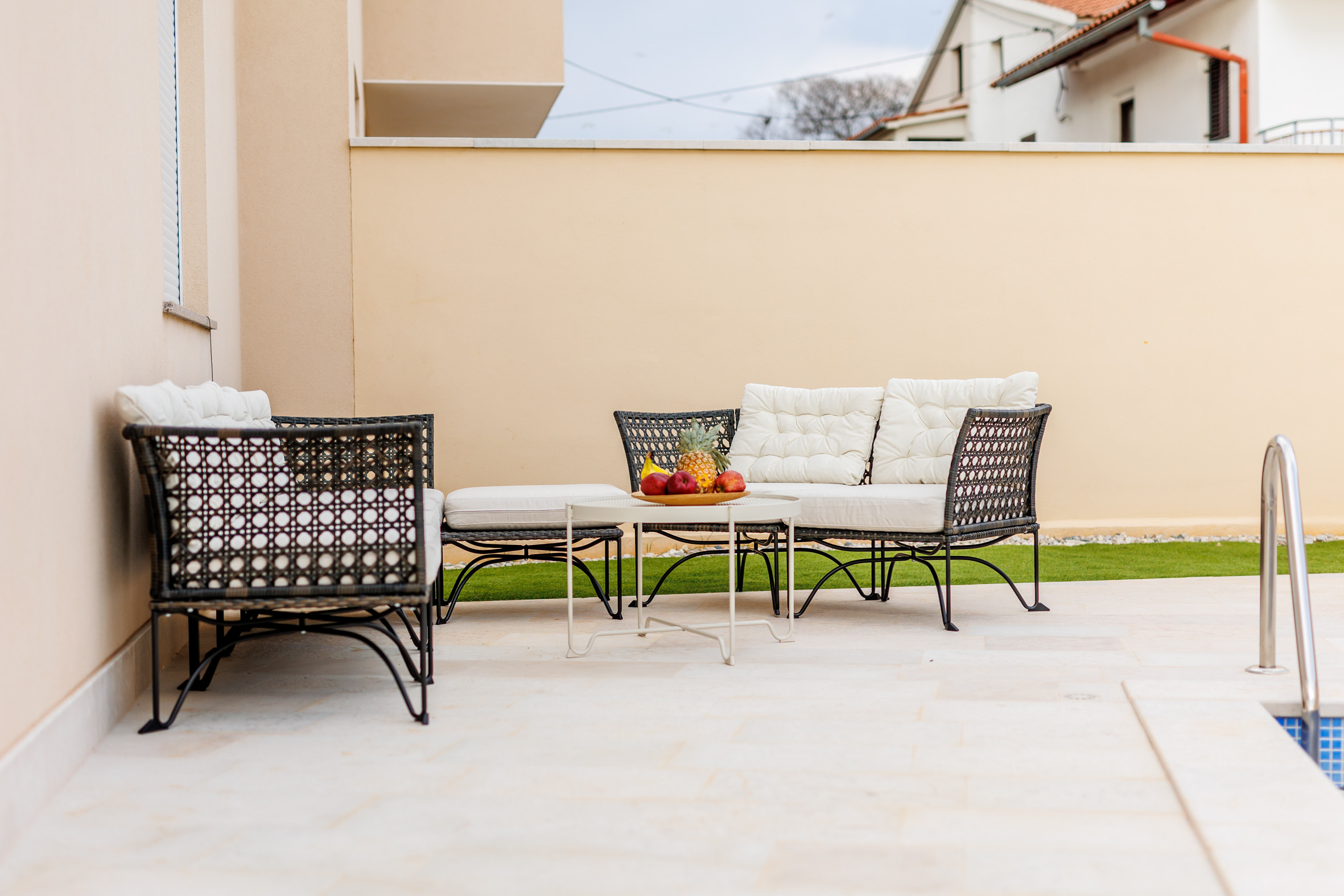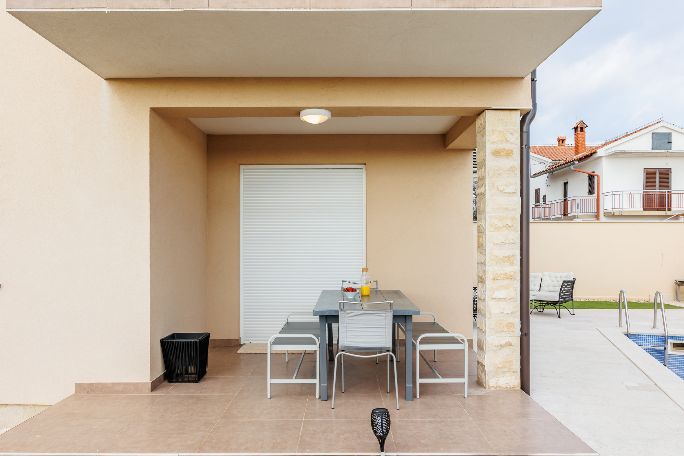 Die Terrasse ist mit einem Esstisch ausgestattet und eignet sich ideal, um den Morgenkaffee zu genießen, gemeinsam zu essen oder einfach in einer ruhigen Umgebung im Freien zu entspannen. Auf der Terrasse befindet sich außerdem ein privater Swimmingpool mit einer Fläche von 27 m² – der perfekte Ort, um sich abzukühlen und die mediterrane Atmosphäre zu genießen.