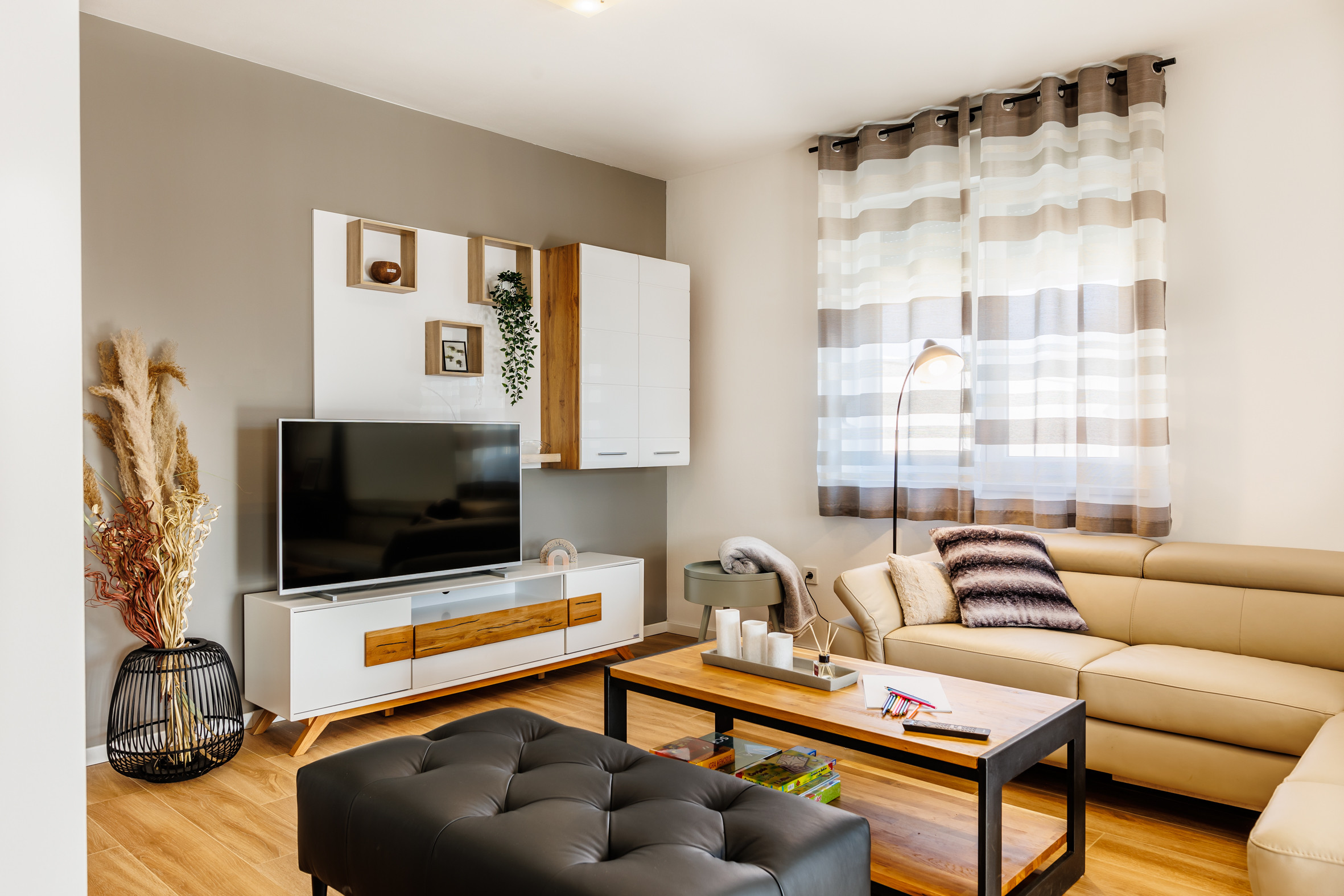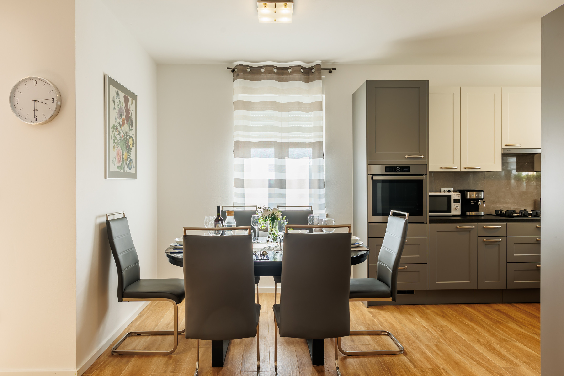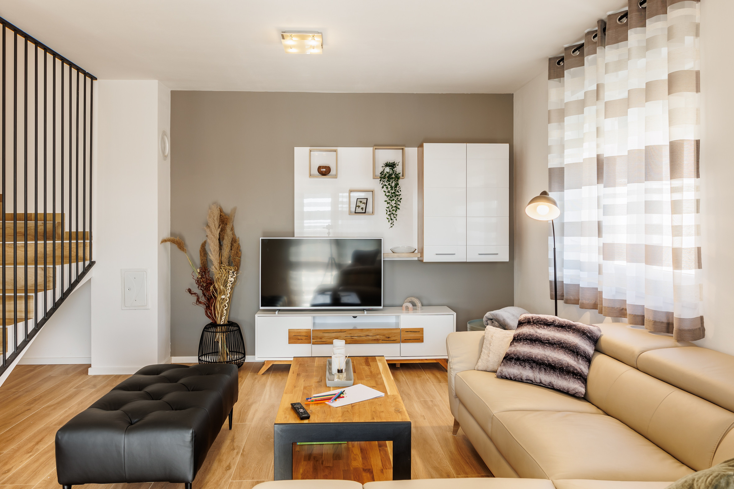 Im Erdgeschoss finden die Gäste ein helles und einladendes Wohnzimmer, das auf eine schöne Terrasse führt. Im Wohnzimmer befindet sich ein Schlafsofa für zwei weitere Personen. Die Küche ist vollständig mit allen notwendigen Geräten und Utensilien ausgestattet, sodass Gäste problemlos köstliche Gerichte zubereiten können, während das Esszimmer über einen Tisch für bis zu sechs Personen verfügt.