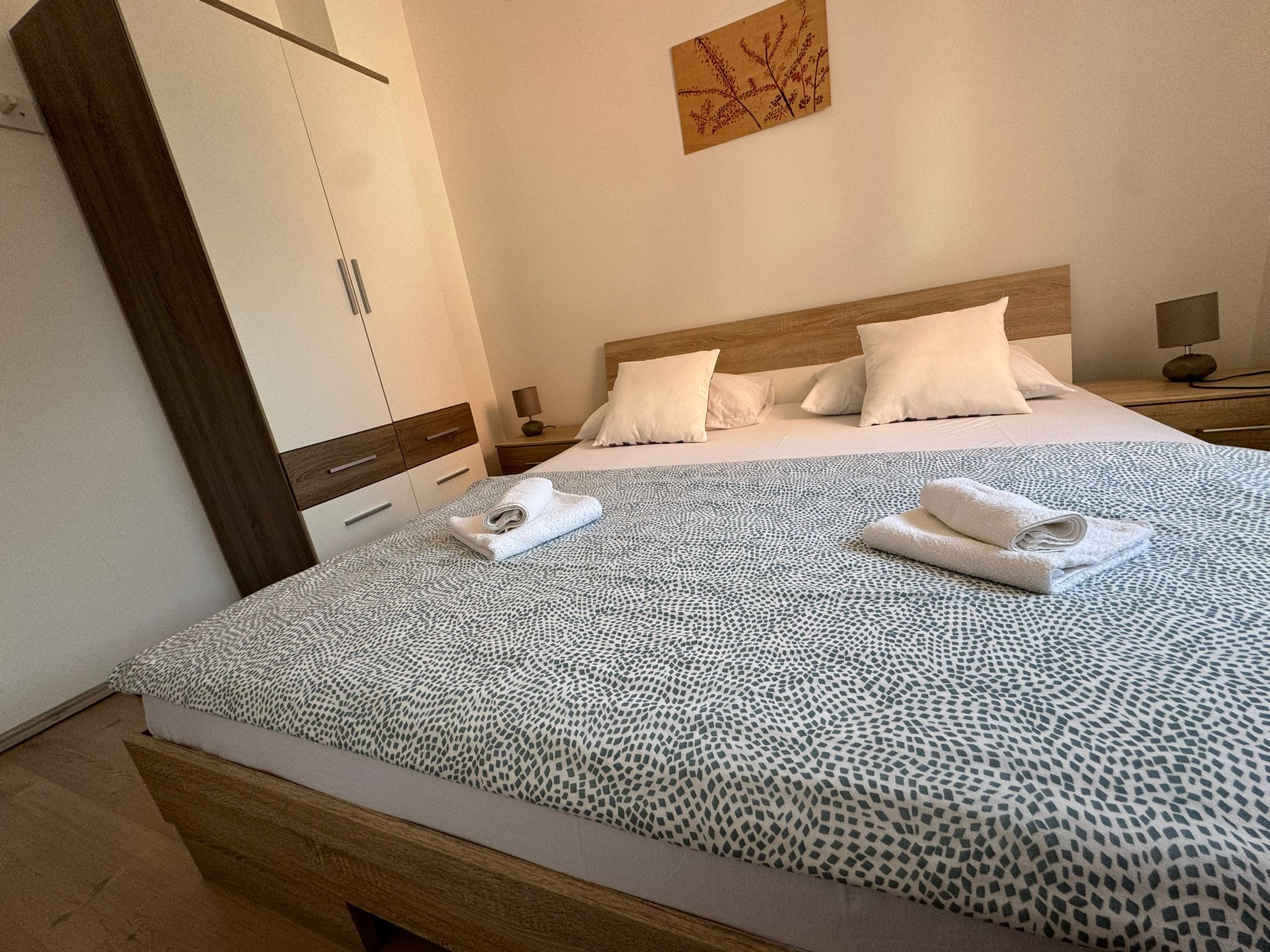 Die Wohnung verfügt über ein Schlafzimmer mit einem bequemen Doppelbett und einer zusätzlichen Schlafcouch, die bis zu drei Gäste beherbergen kann. Das Schlafzimmer ist mit hochwertiger Bettwäsche und ausreichend Stauraum ausgestattet, um einen erholsamen Schlaf zu gewährleisten.