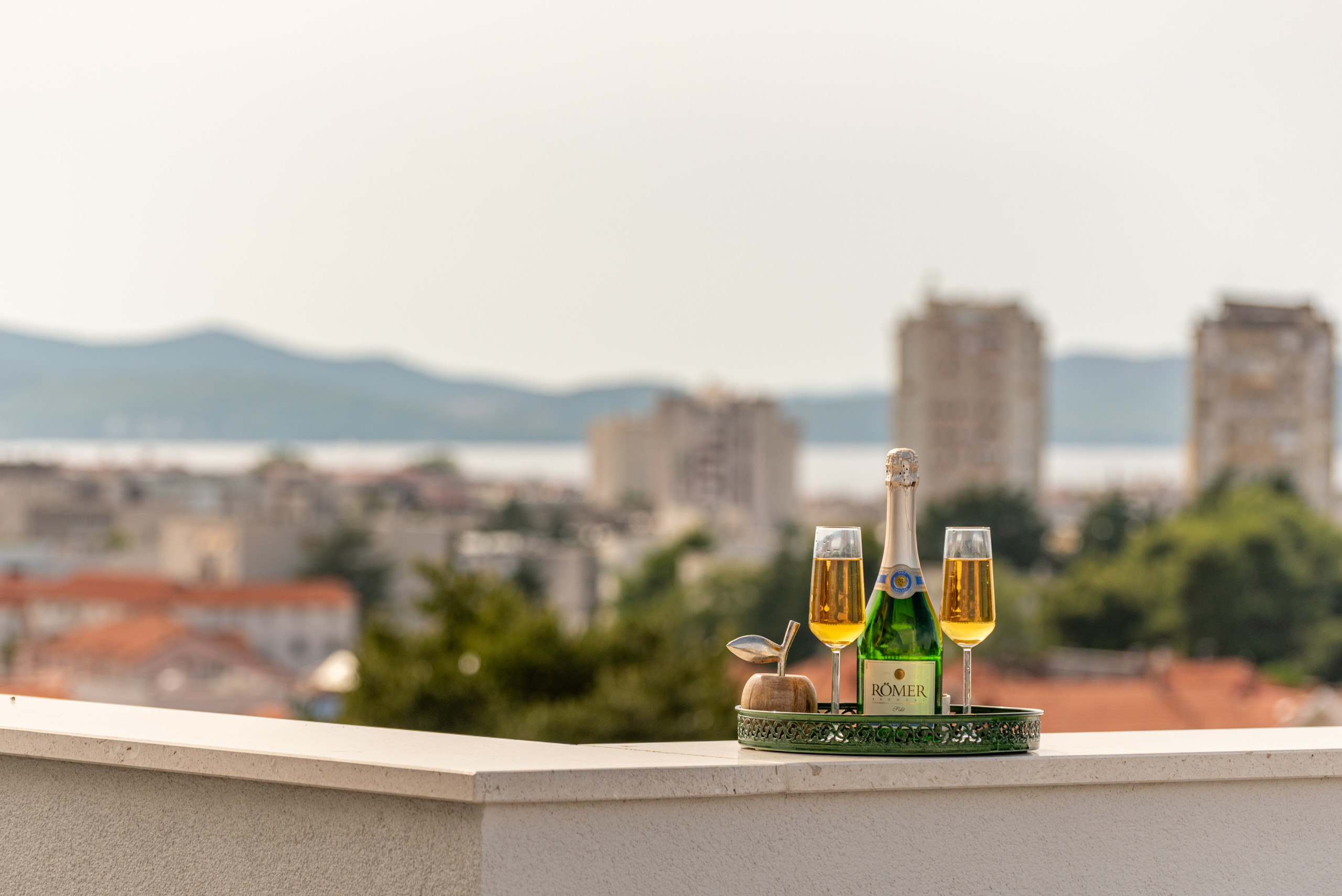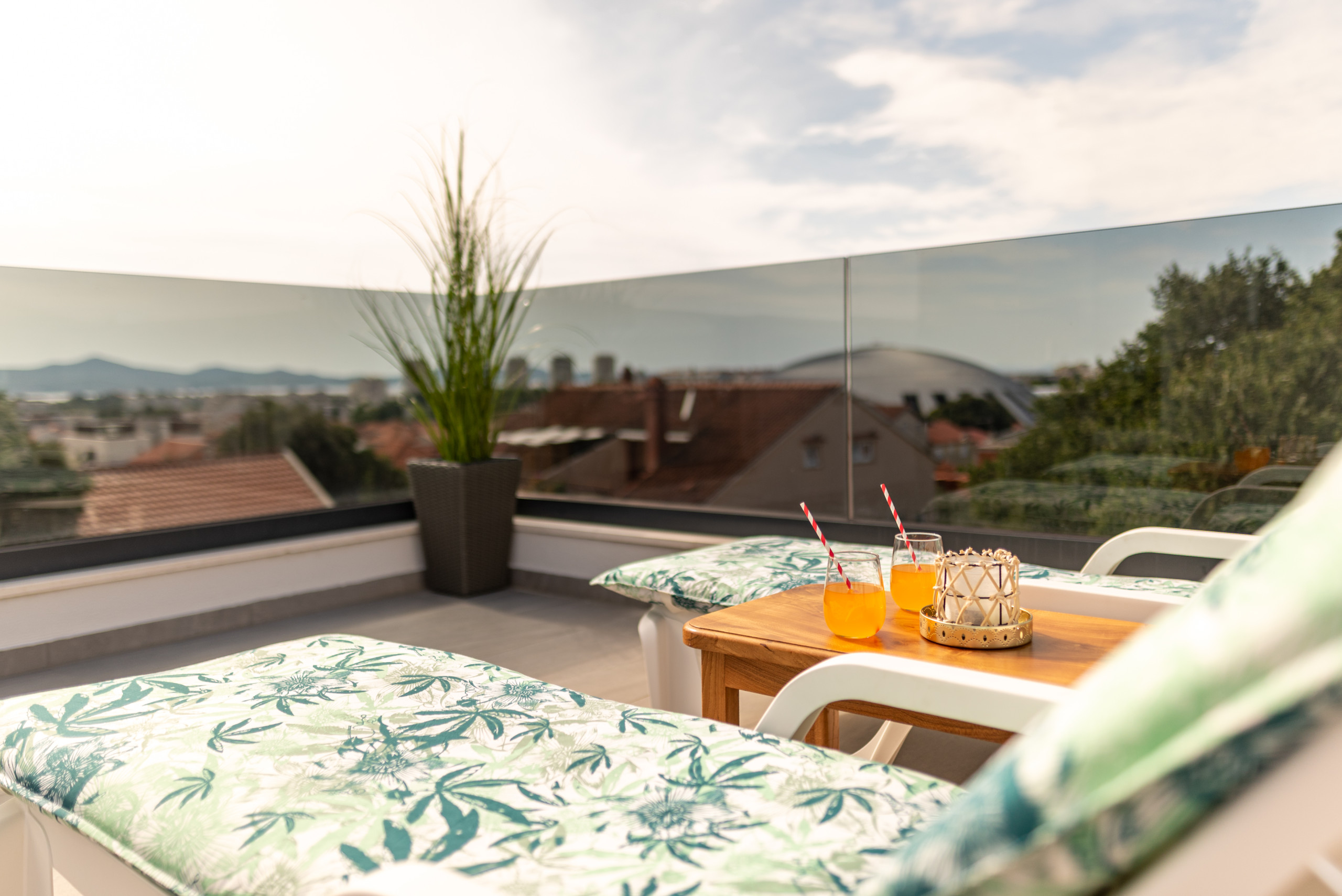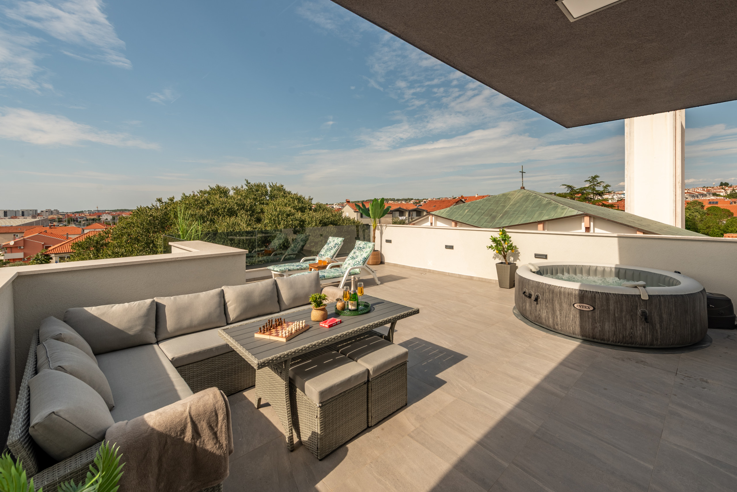 Das Highlight des Deluxe Apartments Anelle ist zweifellos die private Dachterrasse, die ausschließlich vom Apartment aus zugänglich ist. Diese beeindruckende 40 m² große Terrasse bietet ein einzigartiges Erlebnis mit einem Whirlpool für 5 Personen, Sonnenliegen und Gartenmöbeln, ideal für totale Entspannung und Genuss im Freien. Von der Terrasse aus genießen Sie einen atemberaubenden Panoramablick auf die Stadt und das Meer, was sie zum perfekten Ort für Sonnenuntergänge, abendliche Entspannung oder unvergessliche Momente mit Familie und Freunden macht.