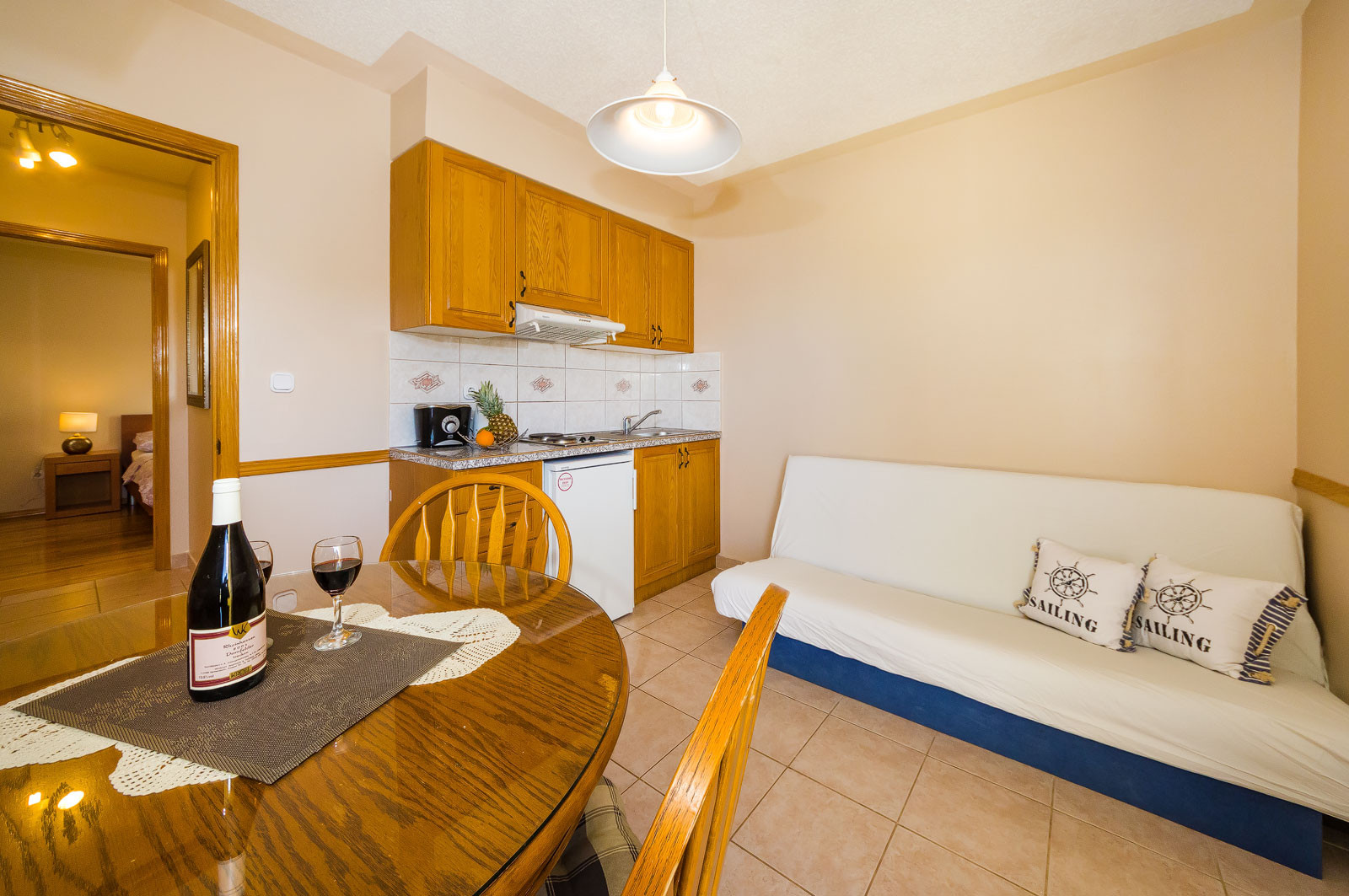 Das geräumige und gemütlich eingerichtete Apartment Mareo 3 ist ideal für einen erholsamen Urlaub für maximal zwei Personen. Es ist 30 m² groß, klimatisiert und verfügt über ein Schlafzimmer mit einem Doppelbett, ein Wohnzimmer, eine ausgestattete Küche und einen Essbereich. Außerdem gibt es 1 Badezimmer mit Dusche. Der Balkon bietet einen wunderschönen Blick auf das Meer, perfekt für den Morgenkaffee oder um abends den Sonnenuntergang zu genießen.