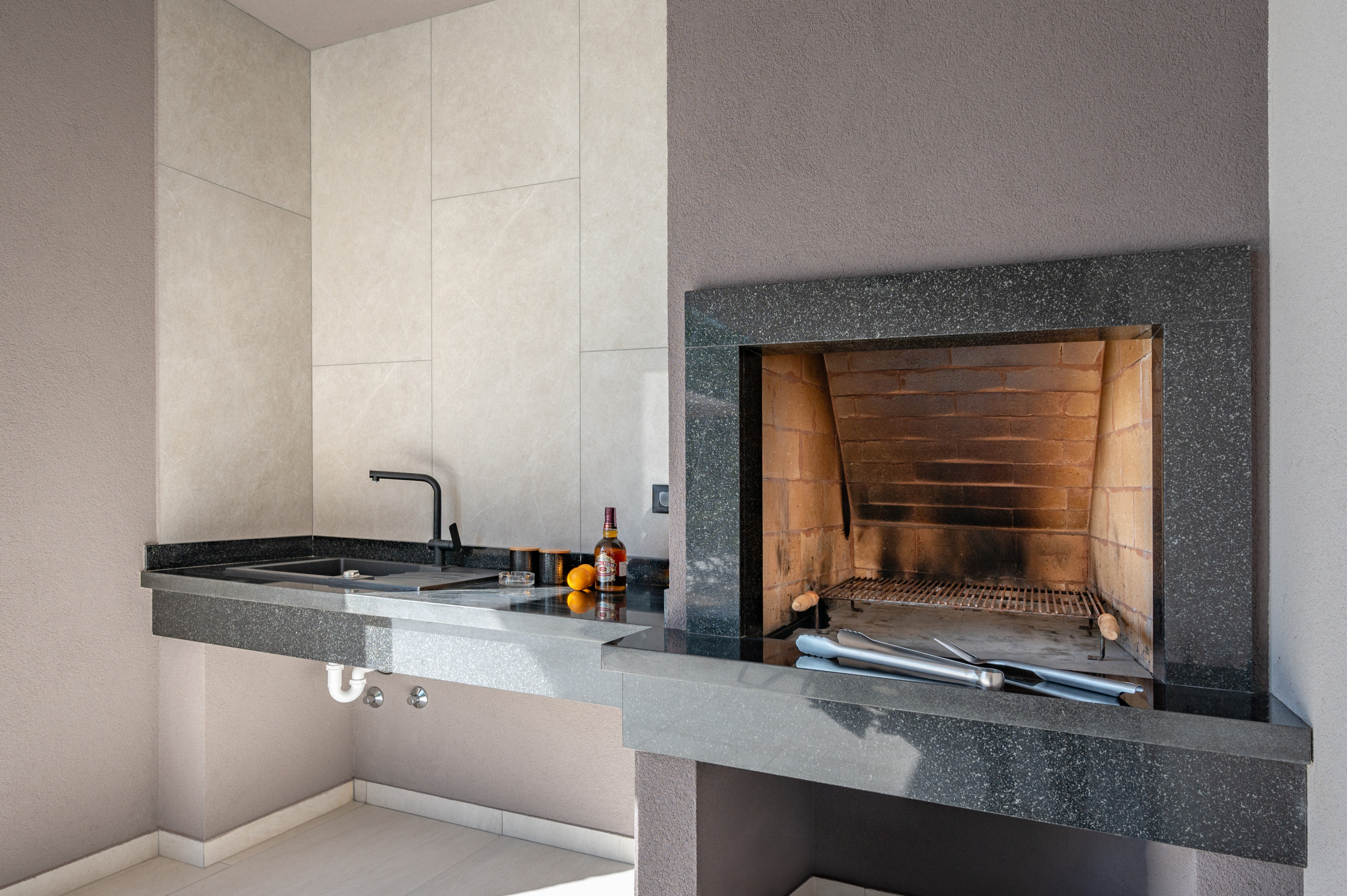 Ein großer Esstisch und ein Holzgrill bieten den perfekten Ort für entspannte Grillabende am Pool.