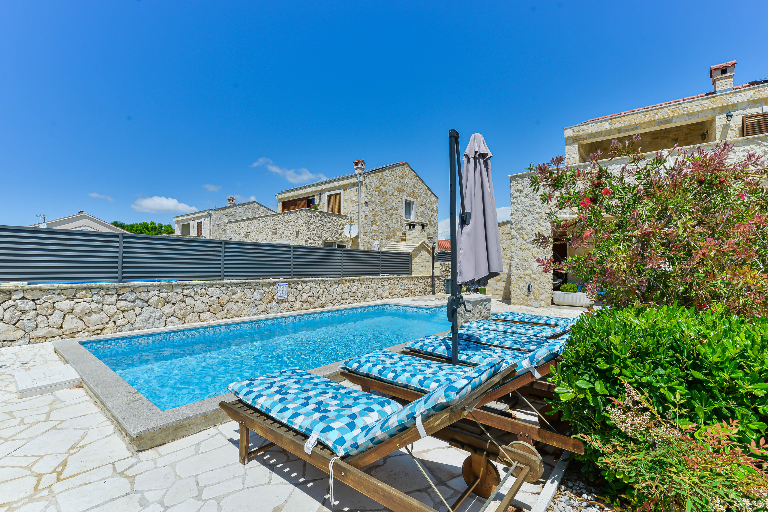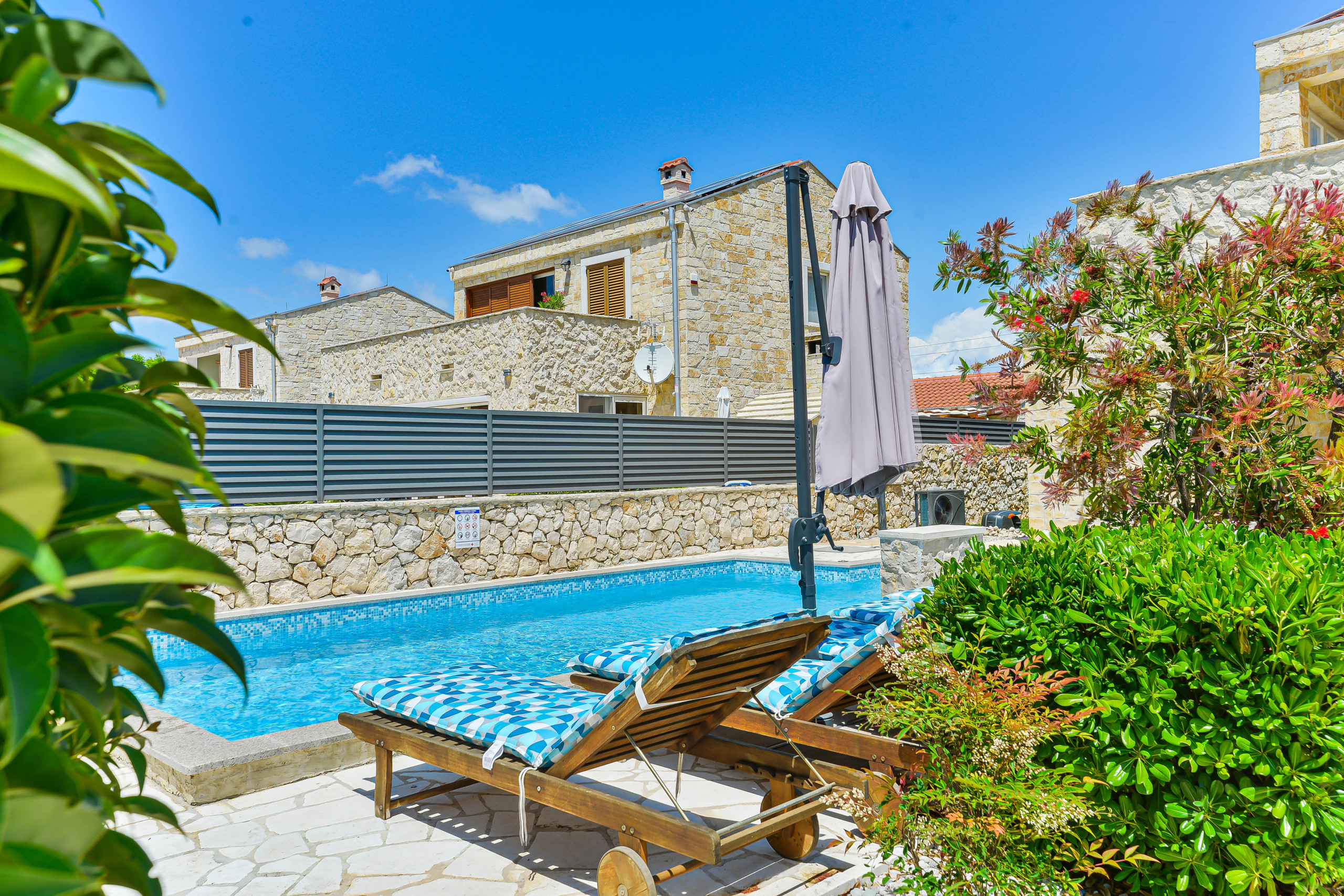Der schönste Ort in der Villa ist sicherlich die wunderschöne Außenterrasse mit einem 35 m² großen beheizten Salzwasserpool. Neben dem Pool befinden sich Sonnenliegen, ein Sonnenschirm und Gartenmöbel. Auf der Außenterrasse gibt es auch einen Esstisch und einen Grill. Hier können Sie Ihre kulinarischen Fähigkeiten unter Beweis stellen und traditionelle dalmatinische Gerichte zubereiten.
