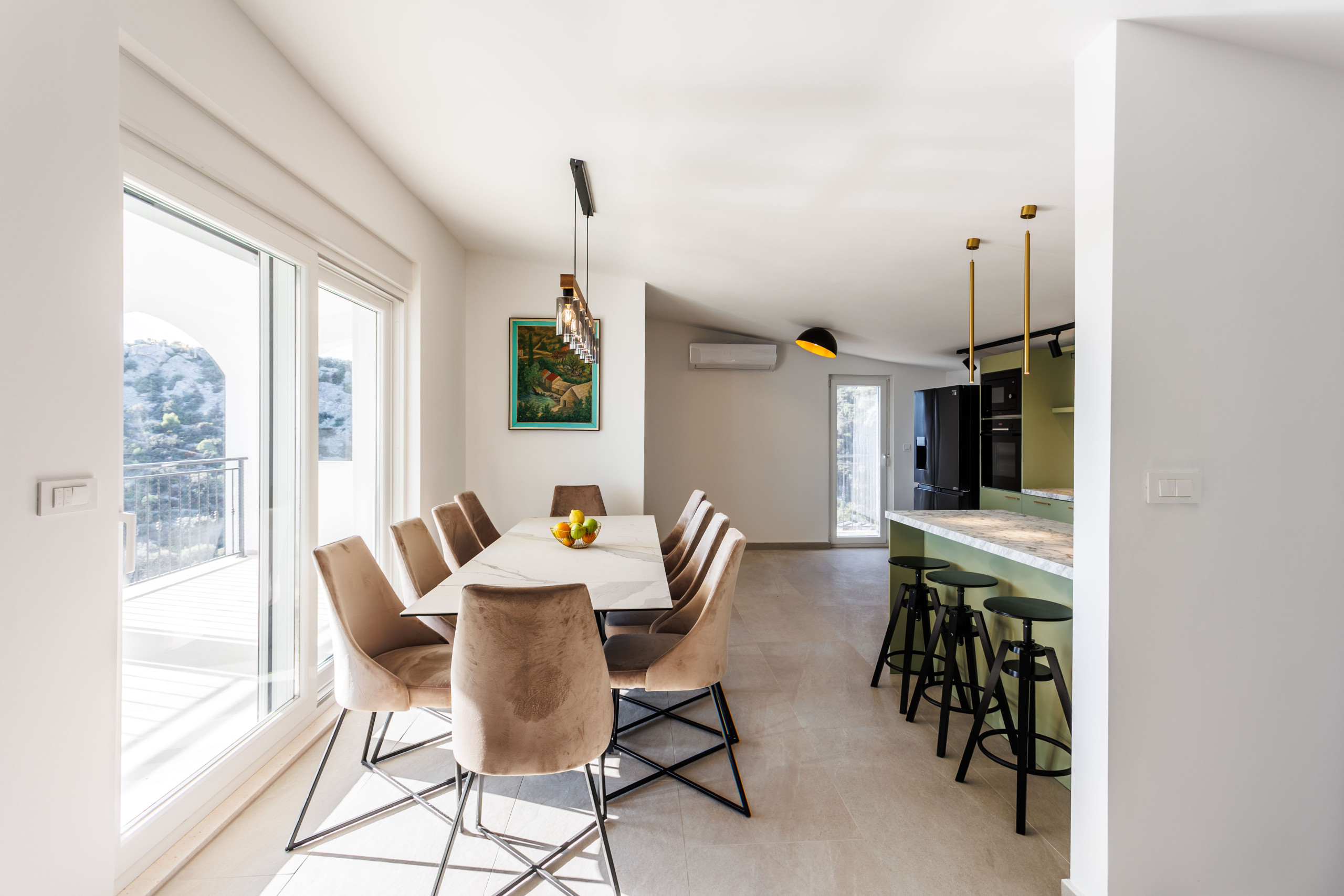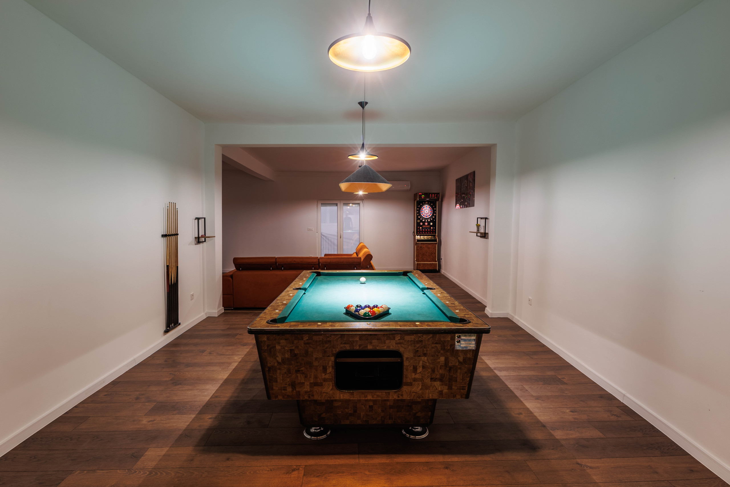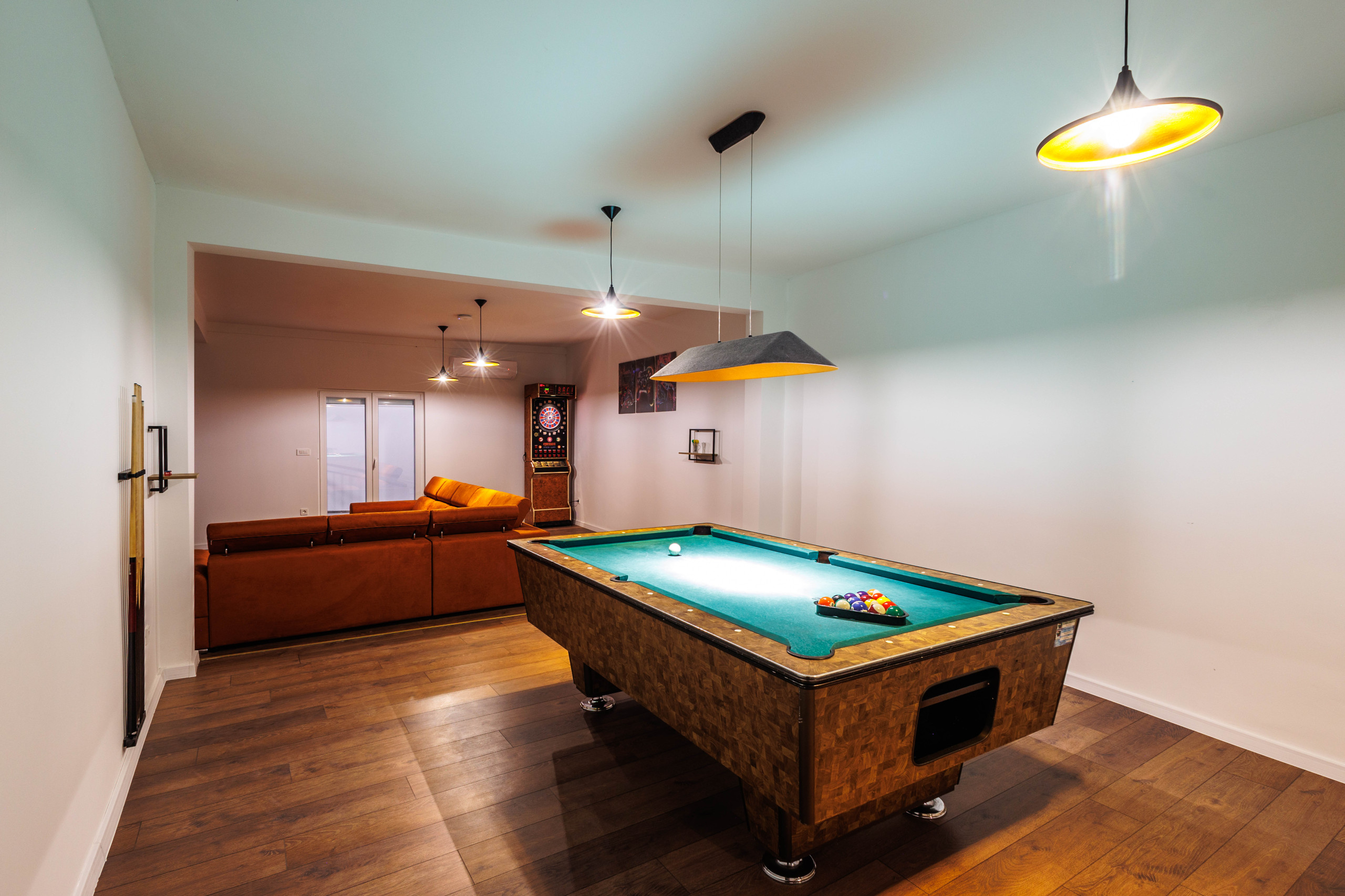 Das Interieur ist durchdacht auf zwei Etagen verteilt. Im Erdgeschoss befinden sich drei Schlafzimmer, ein Essbereich sowie ein voll ausgestatteter Unterhaltungsbereich mit Spielzimmer. Im Obergeschoss finden die Gäste zwei weitere Schlafzimmer, eine voll ausgestattete Küche, ein stilvolles Wohnzimmer, eine Terrasse mit schönem Ausblick sowie einen privaten Fitnessraum.