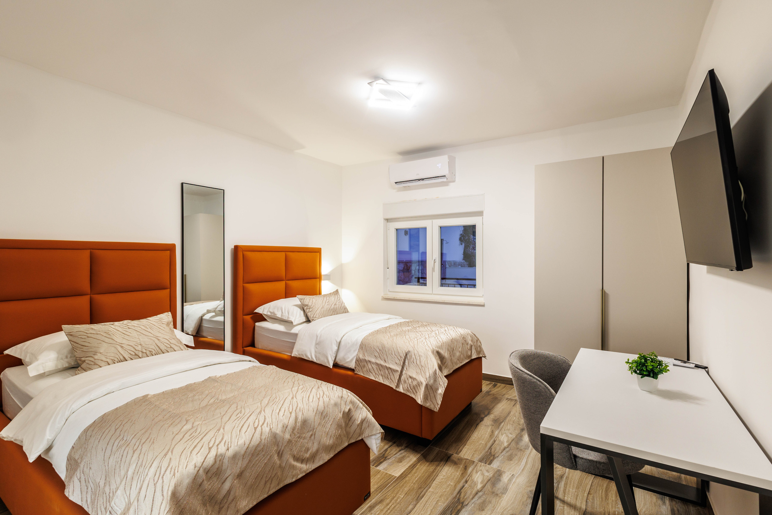 Die Villa verfügt über 5 geräumige, klimatisierte Schlafzimmer, jeweils mit eigenem Badezimmer (en-suite). Vier Schlafzimmer sind mit Doppelbetten ausgestattet, während ein Zimmer über zwei Einzelbetten verfügt – ideal für flexible Belegungen. Insgesamt stehen 6 moderne Badezimmer mit Duschen zur Verfügung.
