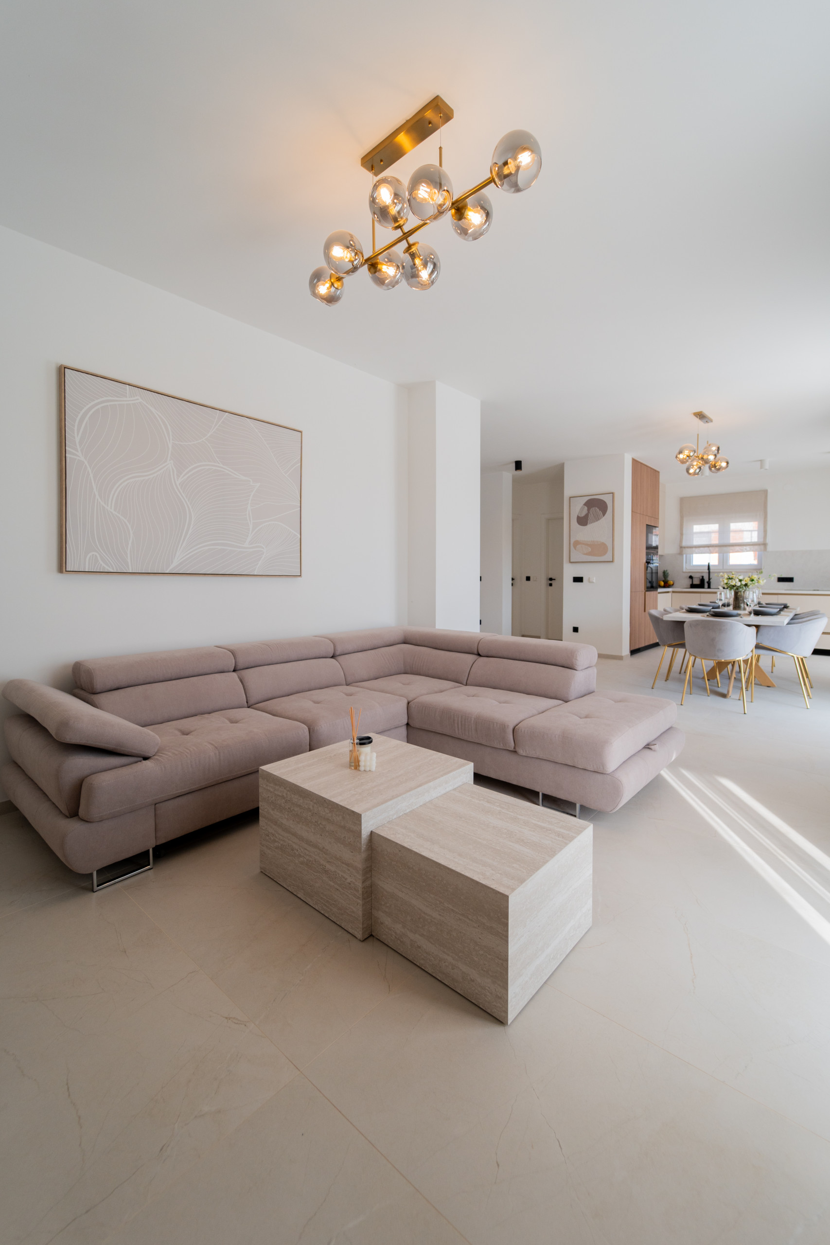 Das geräumige Wohnzimmer lädt zum gemütlichen Beisammensein mit Ihren Lieblingsfilmen ein. Gleich daneben befinden sich die stilvoll eingerichtete und voll ausgestattete Küche sowie das Esszimmer mit Sitzgelegenheiten. Die Küche bietet alles, was Sie für die Zubereitung köstlicher Mahlzeiten für Familie und Freunde benötigen.