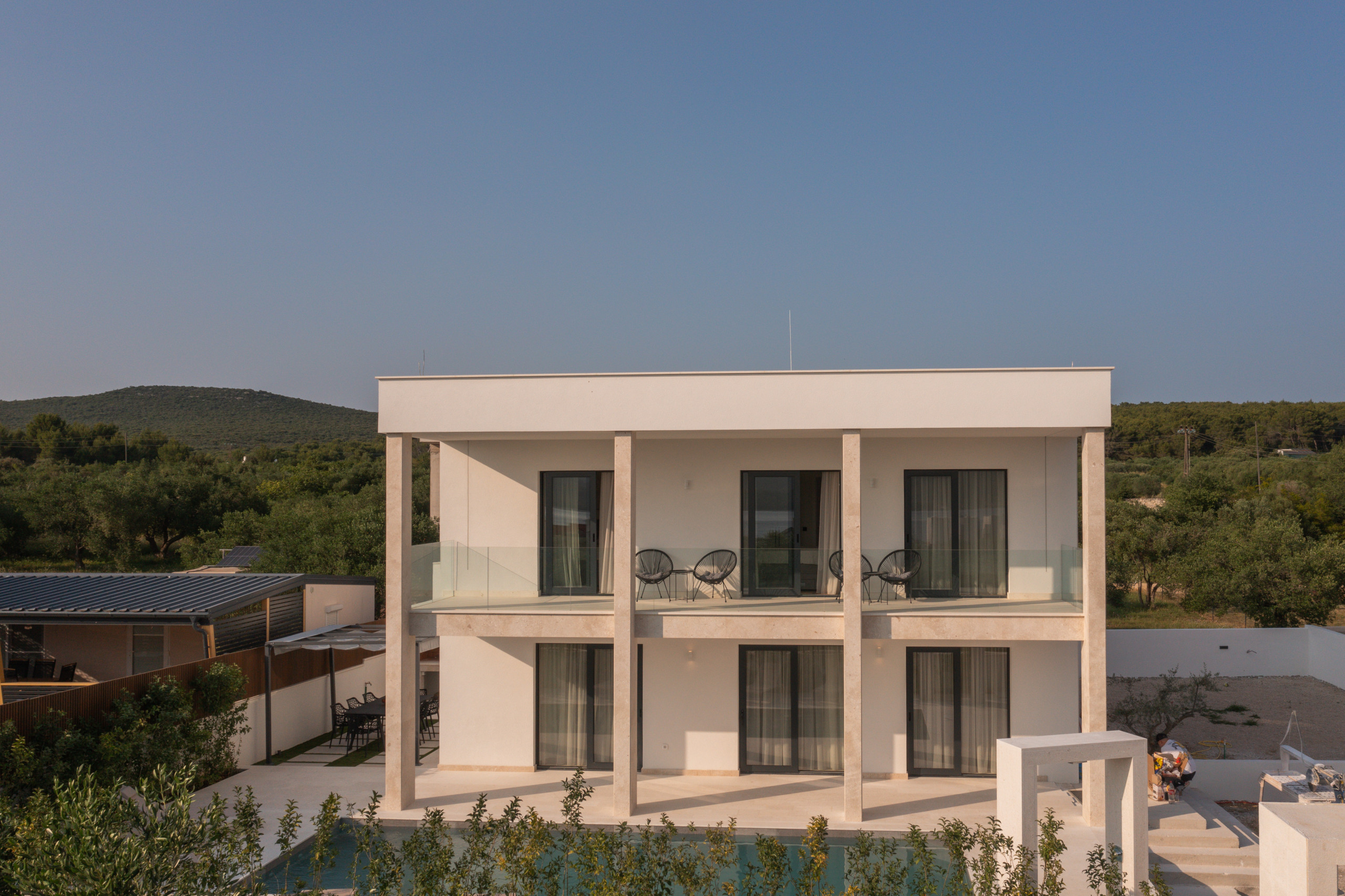 Die Villa Turnea mit Blick auf die Adria bietet Platz für maximal 10 Personen, optimalerweise für 8 Personen. Ihnen stehen 170 m² Wohnfläche zur Verfügung, die Gesamtfläche des Anwesens beträgt 550 m². Die Villa ist vollklimatisiert und verfügt über 4 Schlafzimmer mit Doppelbetten. Ein Schlafzimmer ist ein Hauptschlafzimmer mit eigenem Bad. Es gibt zwei weitere Badezimmer mit Dusche und ein separates WC. Die Villa erstreckt sich über ein Erdgeschoss und ein Obergeschoss. Im Erdgeschoss befinden sich ein Wohnzimmer, ein Schlafzimmer, ein Badezimmer und ein WC, im Obergeschoss drei Schlafzimmer und zwei Badezimmer.