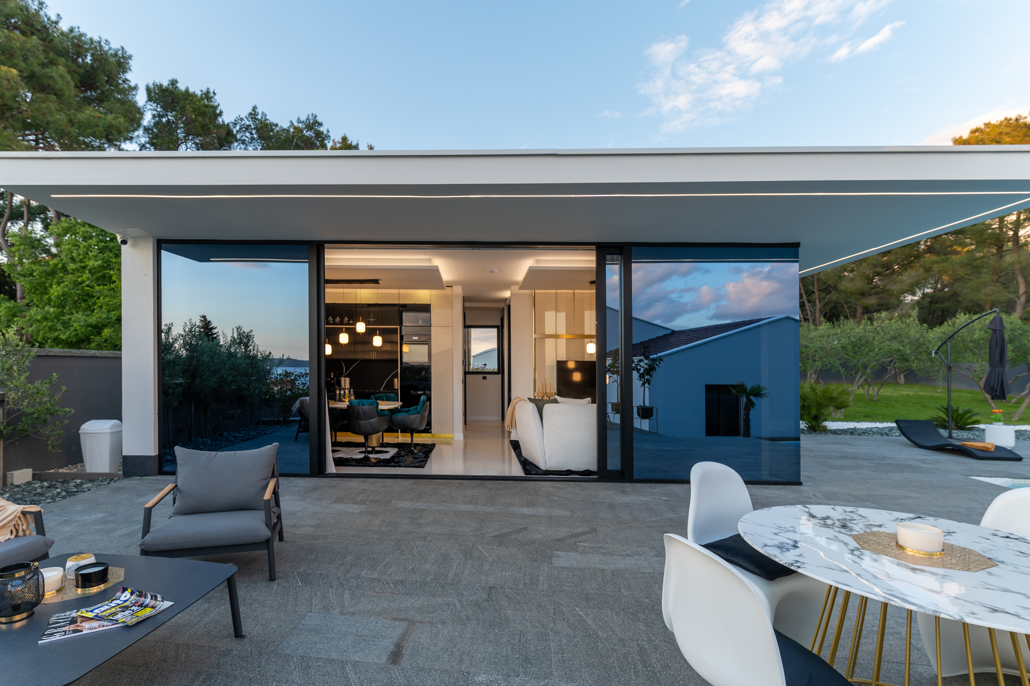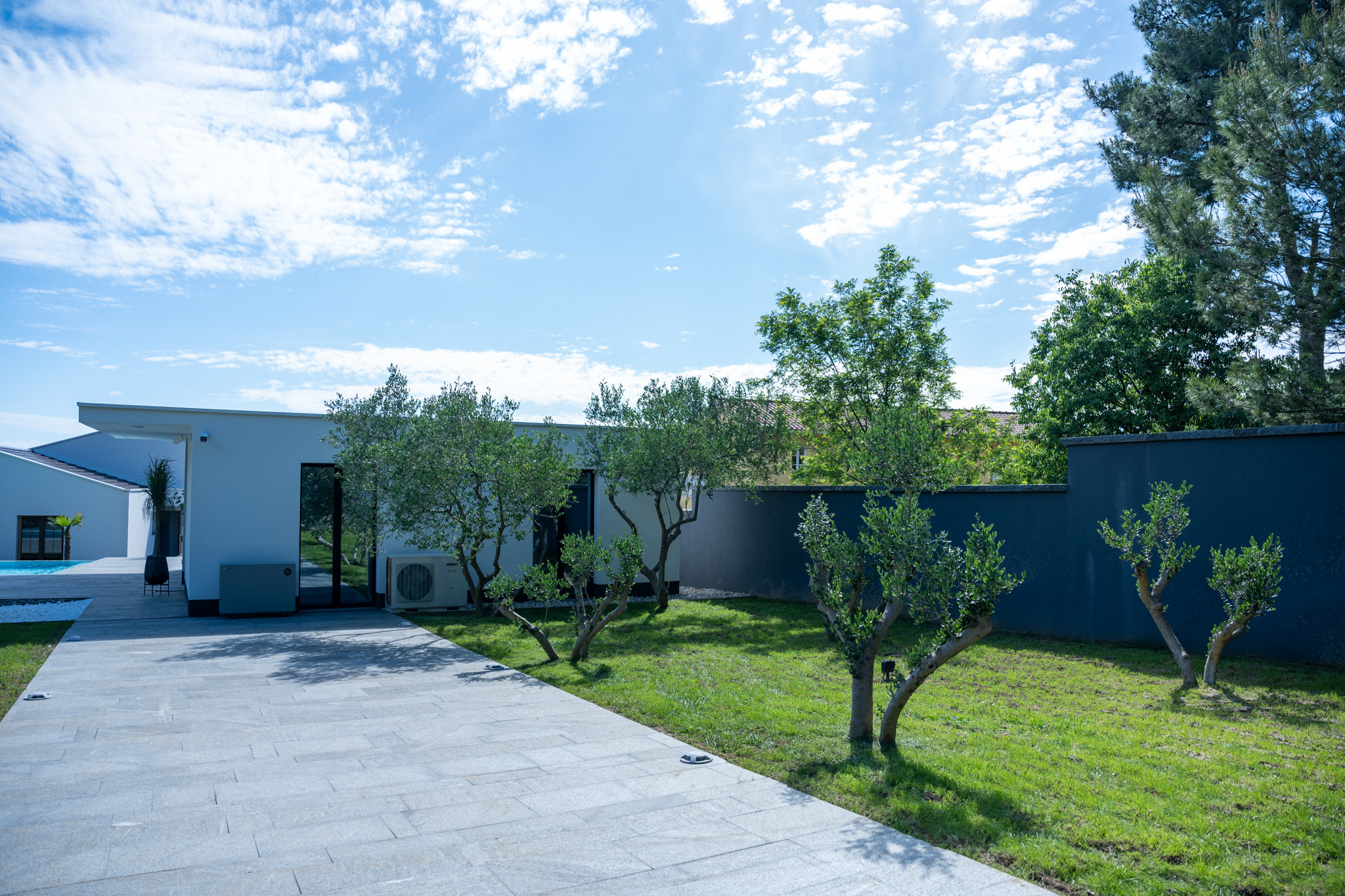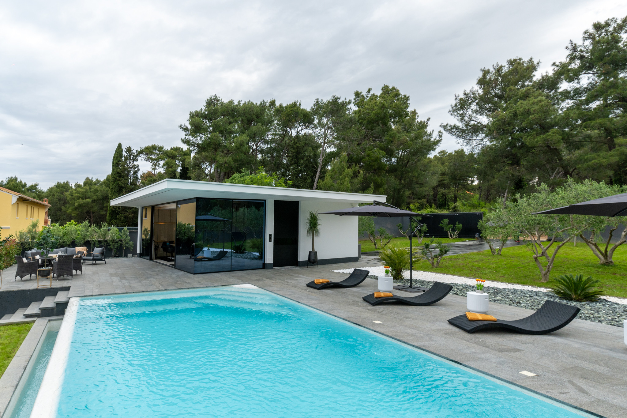 Die Außenterrasse ist ein echter Luxus. Hier genießen Sie den 50 m² großen beheizten Pool, an dessen Seite bequeme Liegestühle stehen. Die Terrasse verfügt auch über einen romantischen Whirlpool und Gartenmöbel, ideal, um Ihren Morgenkaffee in Ruhe zu trinken. Dank des Holzgrills im Freien ist die Zubereitung traditioneller dalmatinischer Gerichte leicht gemacht.