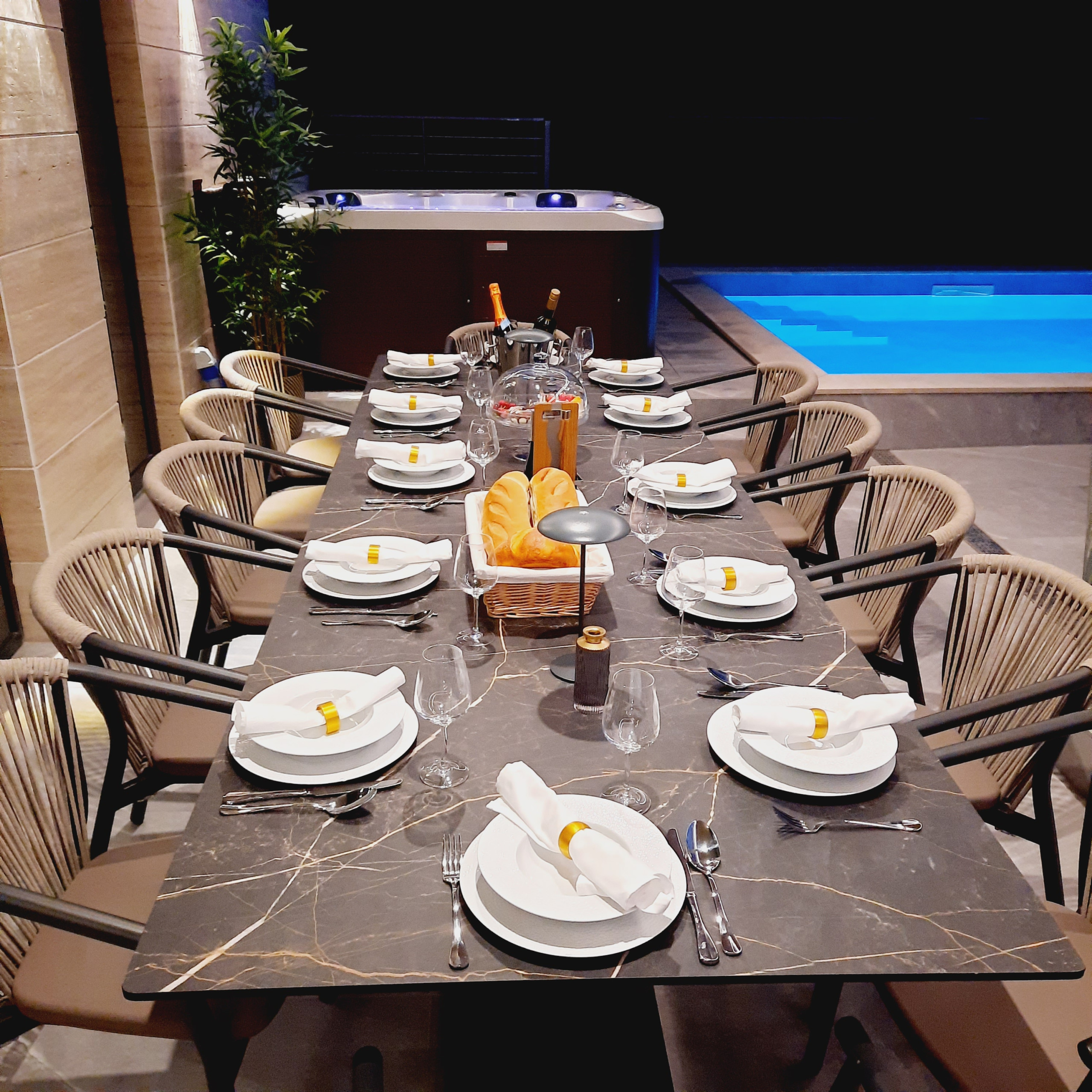 Ein privater, beheizter Pool (40 m²), eine großzügige Terrasse mit Sonnenliegen und ein Essbereich im Freien bieten den perfekten Rahmen zum Entspannen und Genießen lauer Sommerabende. Ein Holzkohlegrill steht ebenfalls zur Verfügung.