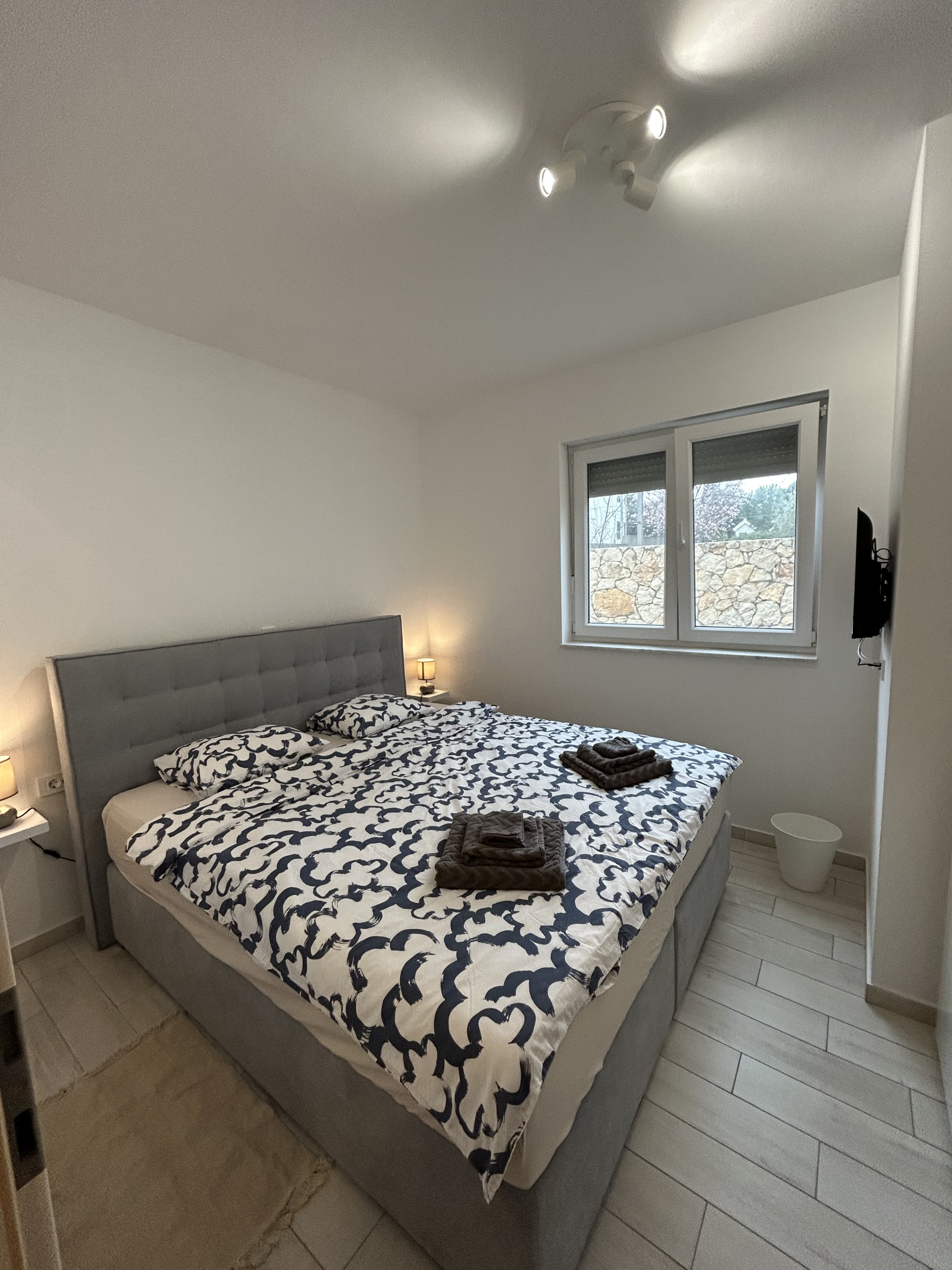 The modern, fully equipped kitchen includes everything needed to prepare traditional Dalmatian dishes, while those who enjoy outdoor cooking can make use of the barbecue. The spacious living room is furnished with a comfortable sofa and a TV, creating a perfect space to unwind after a day in the sun.