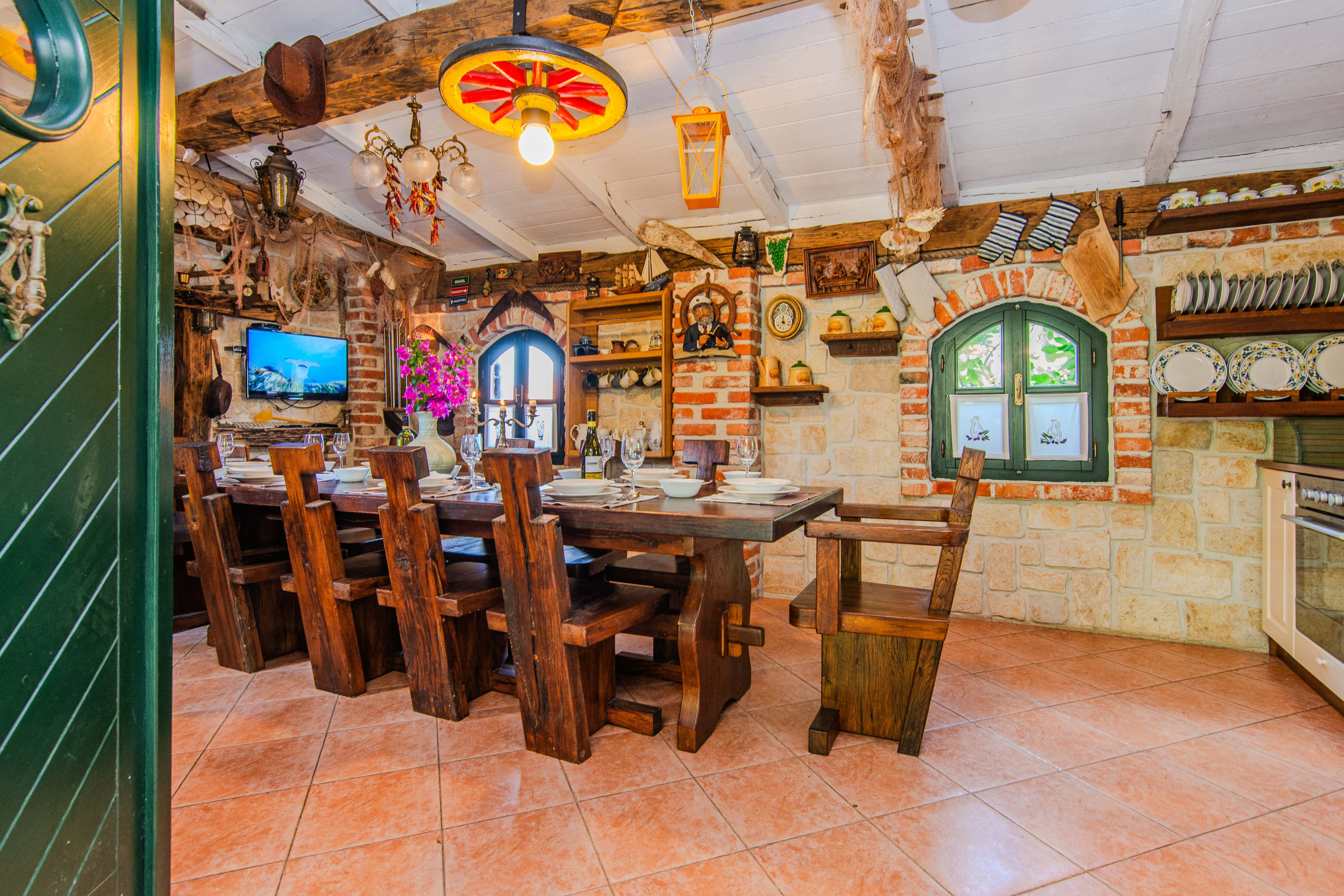 The house consists of a ground floor and a first floor, offering accommodation for up to 8 guests in 4 comfortable bedrooms with large double beds (180 x 200 cm). Two bedrooms are located on the ground floor, while the remaining two are on the first floor, ensuring additional privacy and comfort. The property includes two bathrooms in total and one separate toilet, making it ideal for larger groups. There is also a traditional-style tavern with a fully equipped kitchen where you will find everything you need to prepare delicious meals and unforgettable evenings.