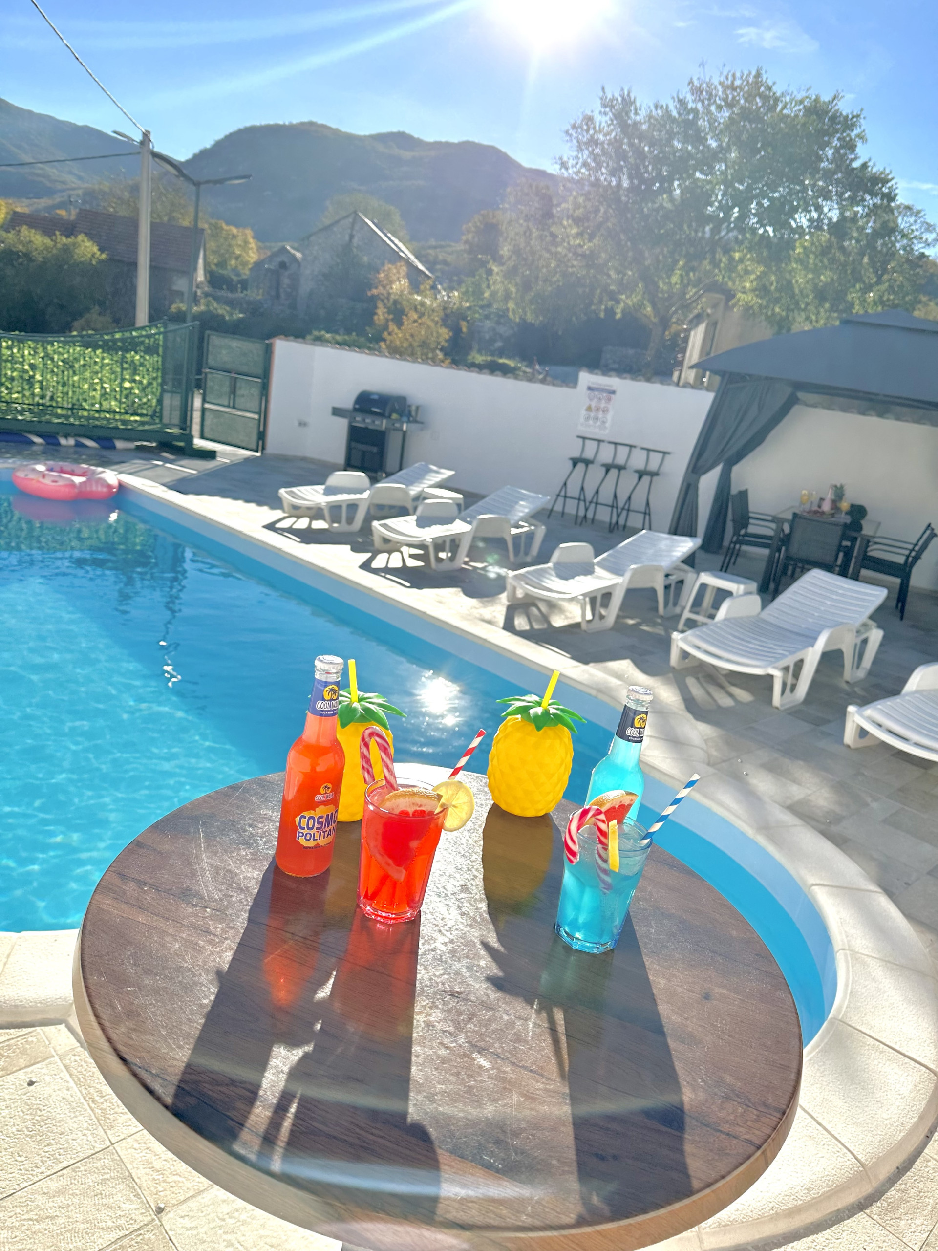 The outdoor area is designed for relaxation and socializing. Guests can enjoy a private, non-heated swimming pool (27 m²) along with an additional smaller pool (5 m²), perfect for refreshing dips on warm days.