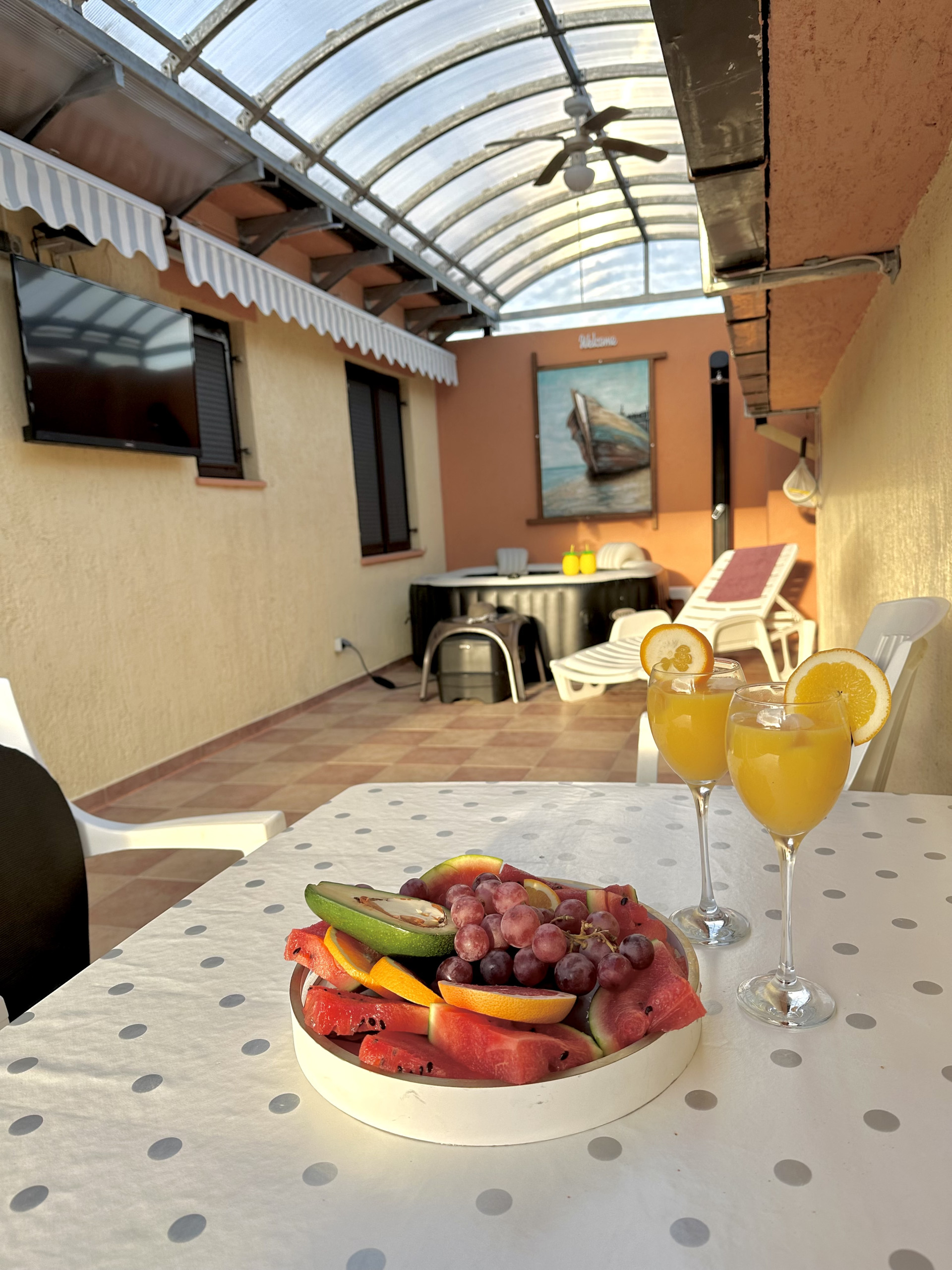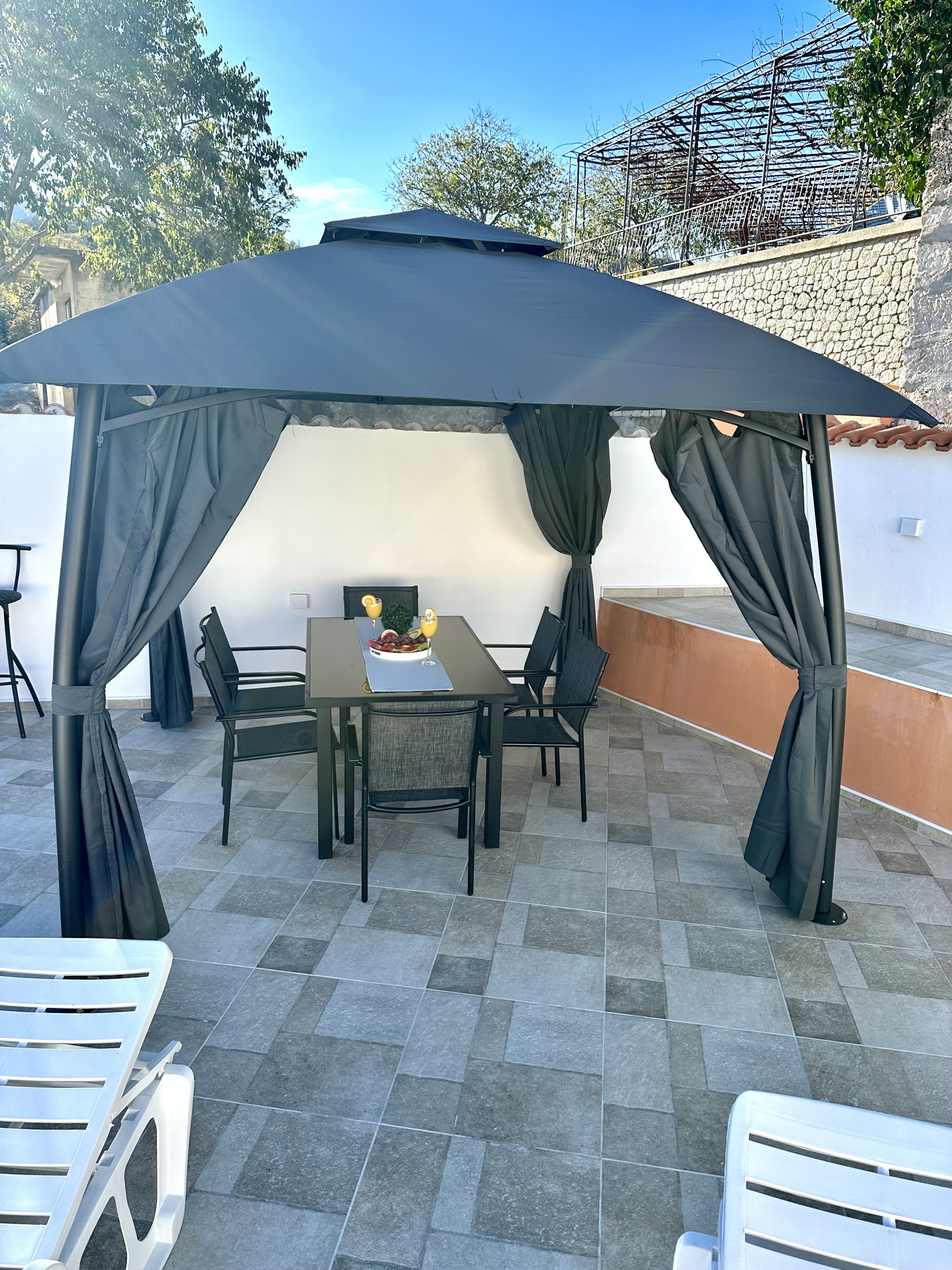 The property also includes both indoor and outdoor barbecue facilities, allowing guests to prepare and enjoy traditional Mediterranean meals. The fully fenced yard ensures privacy, while two private parking spaces are available on-site.