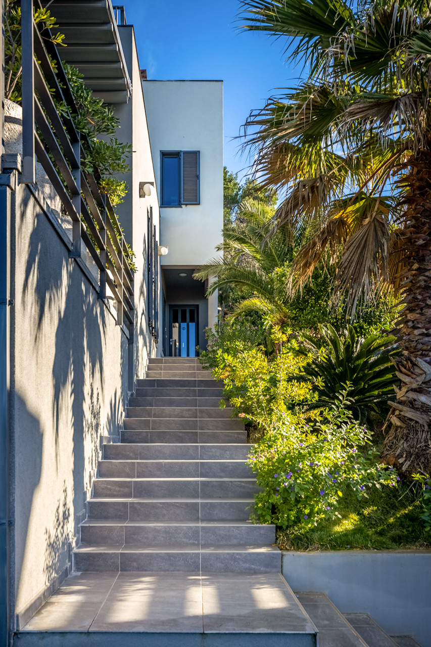 This villa, located only 70 meters from the sea, is ready to open its doors to a maximum of 12 people who have 396 m2 of living space at their disposal. Consisting of two parts, there are 3 bedrooms on the ground floor, while there are 3 more rooms on the first floor. All 6 bedrooms have double beds, and the master bedroom has a sea view and its own en suite bathroom. There are 3 more bathrooms and one separate toilet. The villa is fully air-conditioned and has WiFi. As an additional feature, you can use a washing machine, dryer and iron.