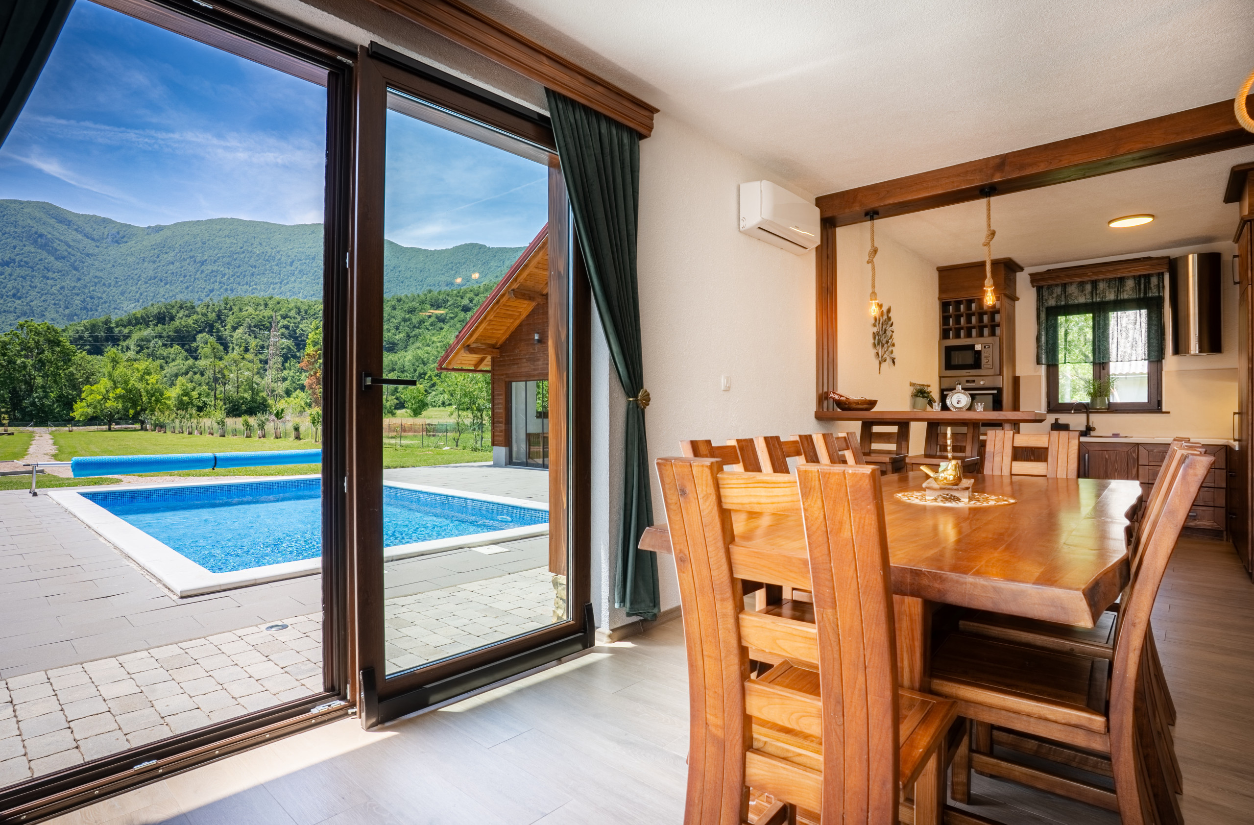 Villa Brusiana is built in a rustic style, and thanks to the wooden interior, it creates a warm atmosphere and a relaxing environment. It offers you 205 m2 of living space, while the area of the property is as much as 4300 m2. It is fully air-conditioned, and offers accommodation for a maximum of 9, and optimally 7 people. You will sleep in 3 bedrooms that have a view of the mountains, you will use 4 bathrooms and 1 separate toilet. The villa has a living room, which is equipped with a sofa, television and a closed fireplace for romantic evenings. The kitchen is equipped with everything you need to prepare delicious meals for family or friends, there is also a dining room with a dining table.