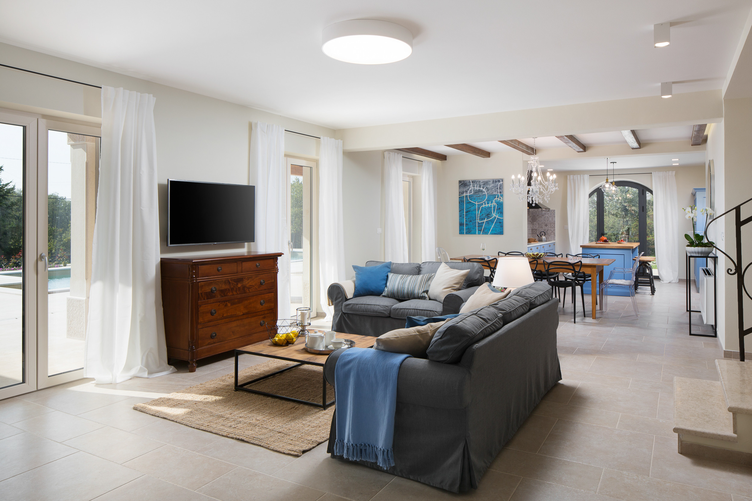Villa Ovi will provide you with everything you need to spend a peaceful and enjoyable vacation with family and friends. It offers accommodation for a maximum of 8 people, and you have 350 m2 of living space at your disposal. The villa is set on a spacious 3.300 m² plot, fully fenced for complete privacy. Nestled in a peaceful natural setting, it offers the perfect escape from the hustle and bustle of the city. Surrounded by greenery, the villa provides a sense of freedom and harmony with nature, making it an ideal place to relax and enjoy tranquility. In the villa you will be comfortably accommodated in 4 bedrooms with double beds and en-suite bathrooms. Three bathrooms are with shower and in the fourth upper master room that opens onto the terrace, there is a bathroom with a bathtub and a sliding glass door.