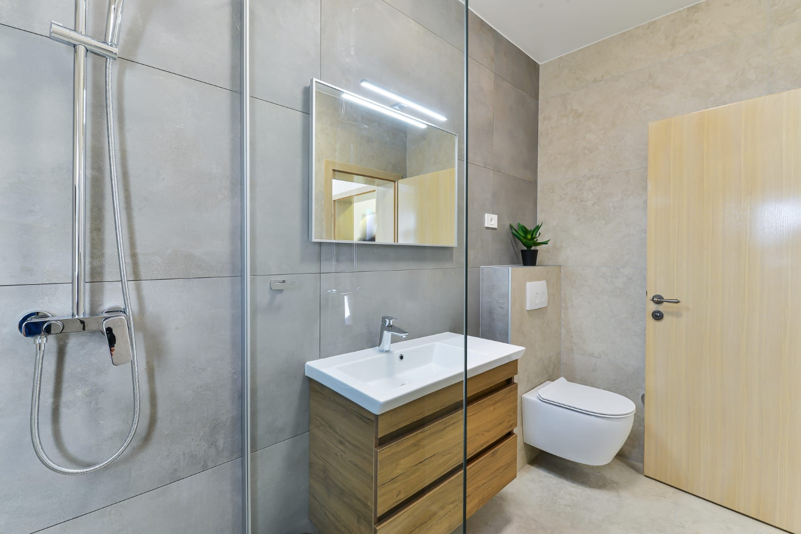 On the ground floor there is a beautifully decorated and modern kitchen that is equipped with everything that will help you prepare your favorite meals for the whole family. There is also a dining room with a dining table, and right next to it is a living room that will be an ideal place for evening gatherings with your favorite movies, and includes a sofa and TV.