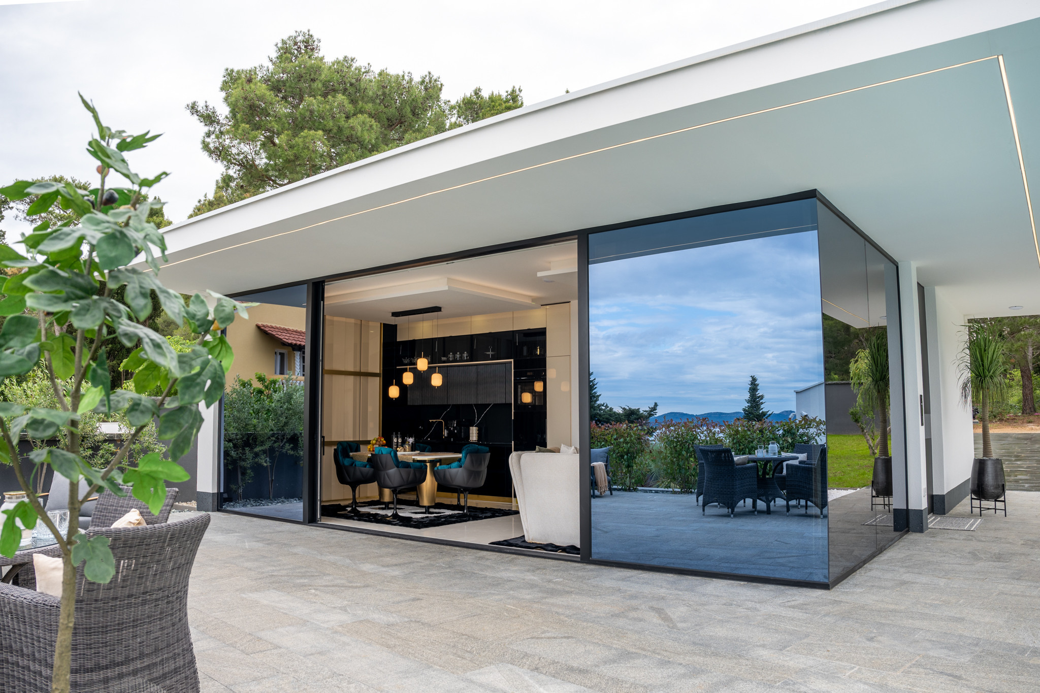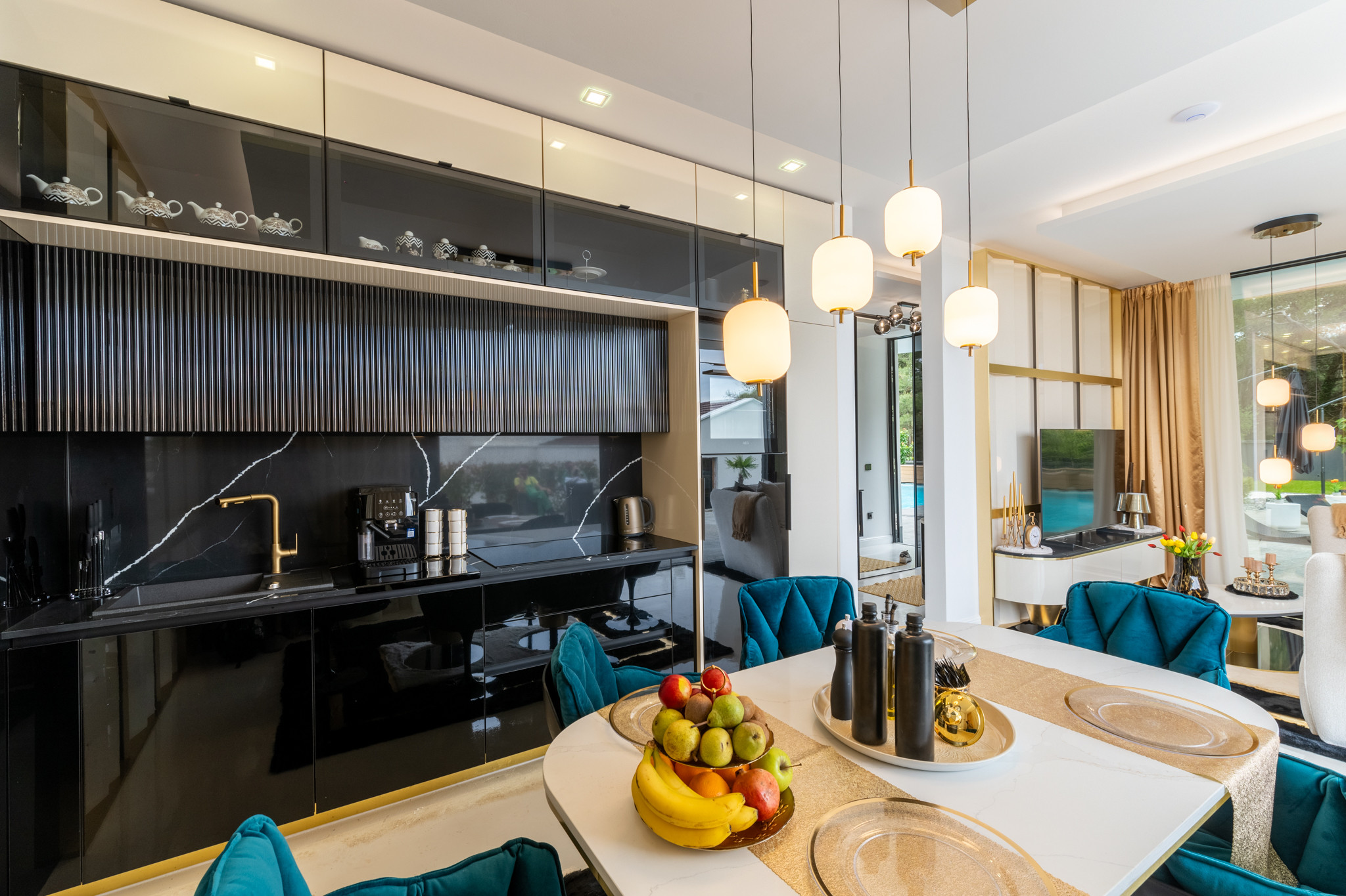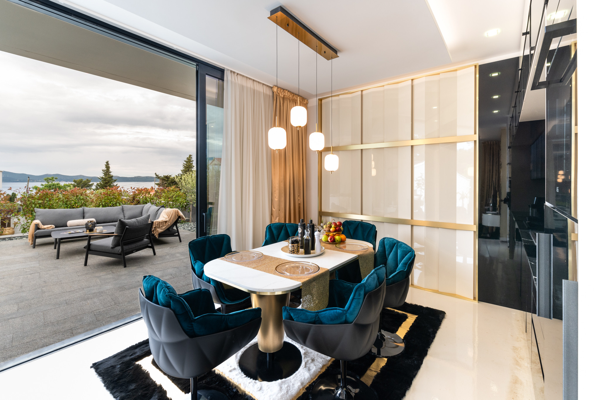 The modern and beautifully decorated kitchen is equipped with everything you need to prepare meals for family or friends, and there is also a beautiful dining room with a dining table. Also, the villa offers a sea view from the kitchen and living room.